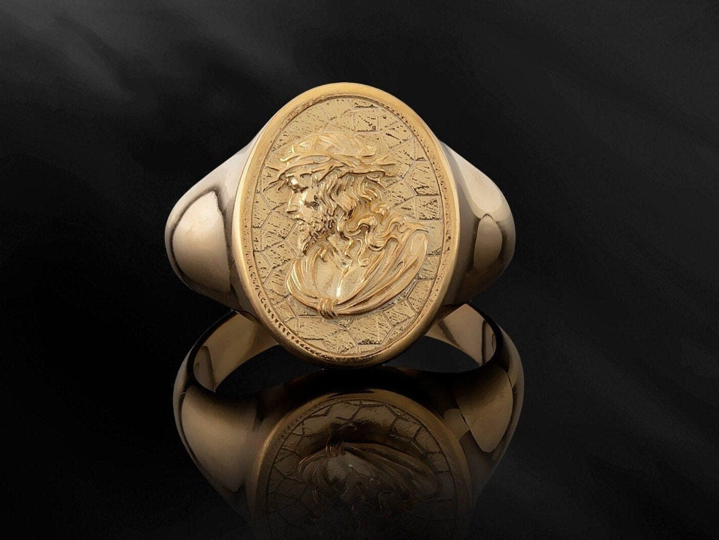 18K Gold Relief Jesus Christ Rings, 14K Gold Savior Crowned Messiah Rings, Religious Christian Men's Jewelry, Unique Gift For Father's Day