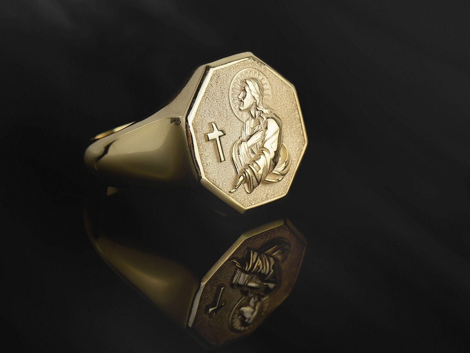14K Solid Gold Jesus Statement Ring, 10K Gold Jesus Head Ring, Religious Catholic Mens Rings, Gift For Father, Unique Gift For Father's Day