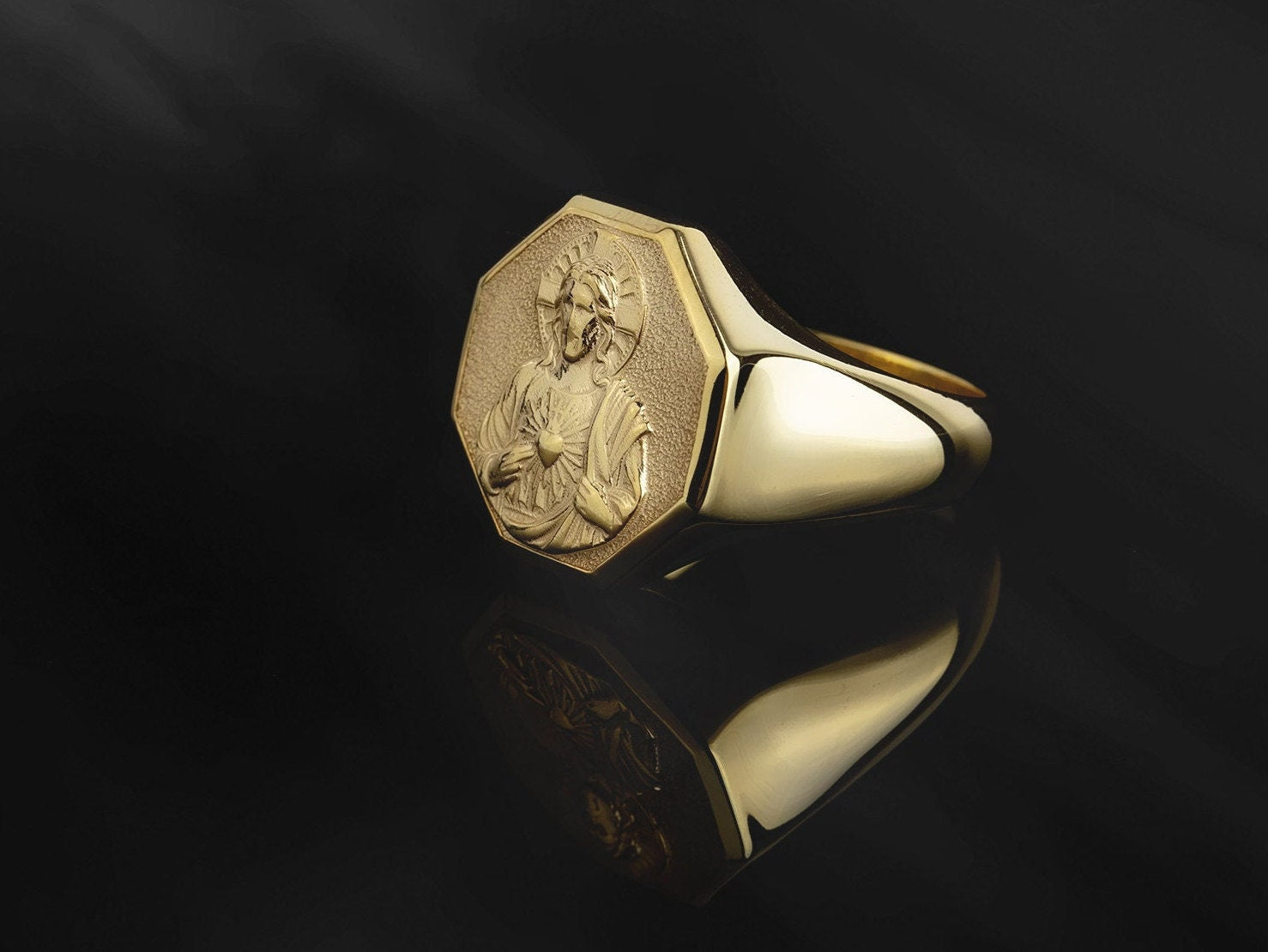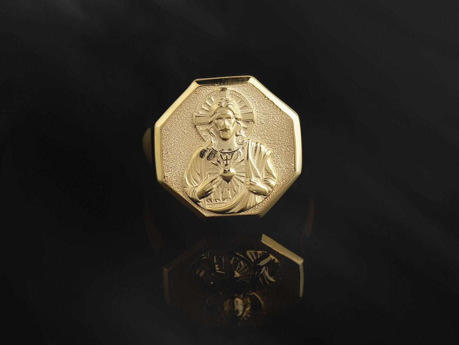 14K Solid Gold Jesus With Sacred Heart Ring, Christian Religious Men's Jewelry, 10K Savior Jesus Christ Rings, Unique Gift For Father's Day