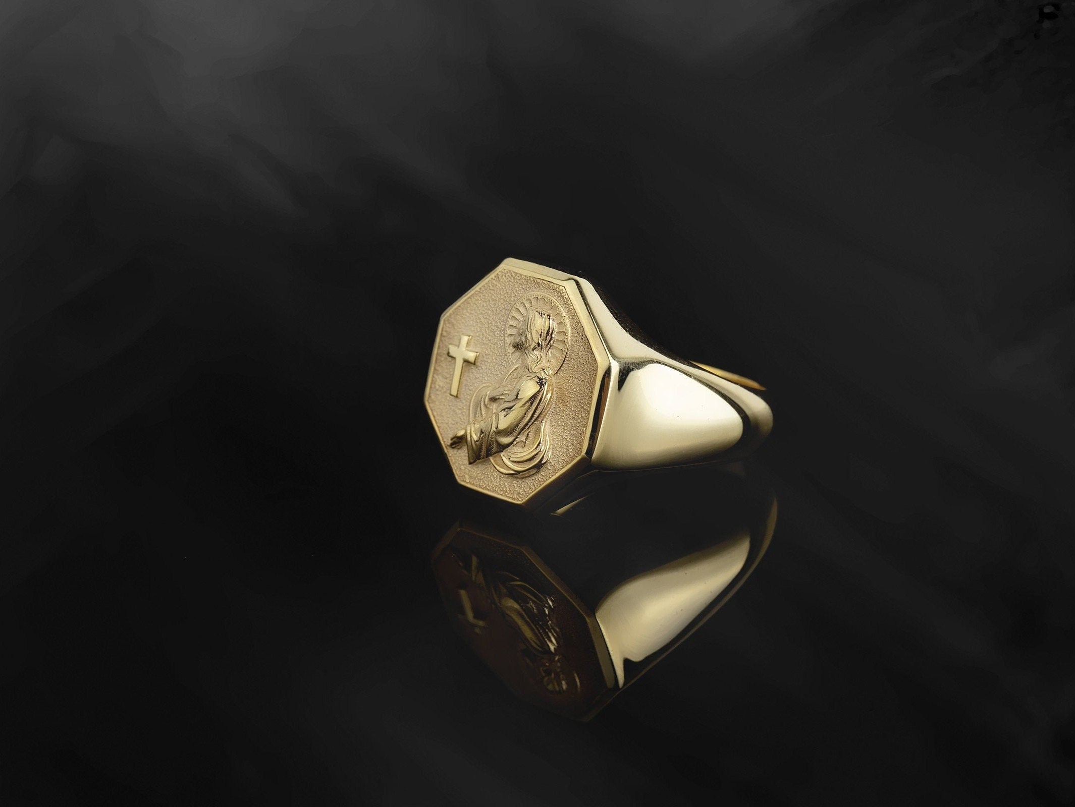 14K Solid Gold Saint Francis Ring, 18K Religious Statement Ring, Catholic Men's Rings, St Francis Signet Ring, Unique Gift For Father's Day