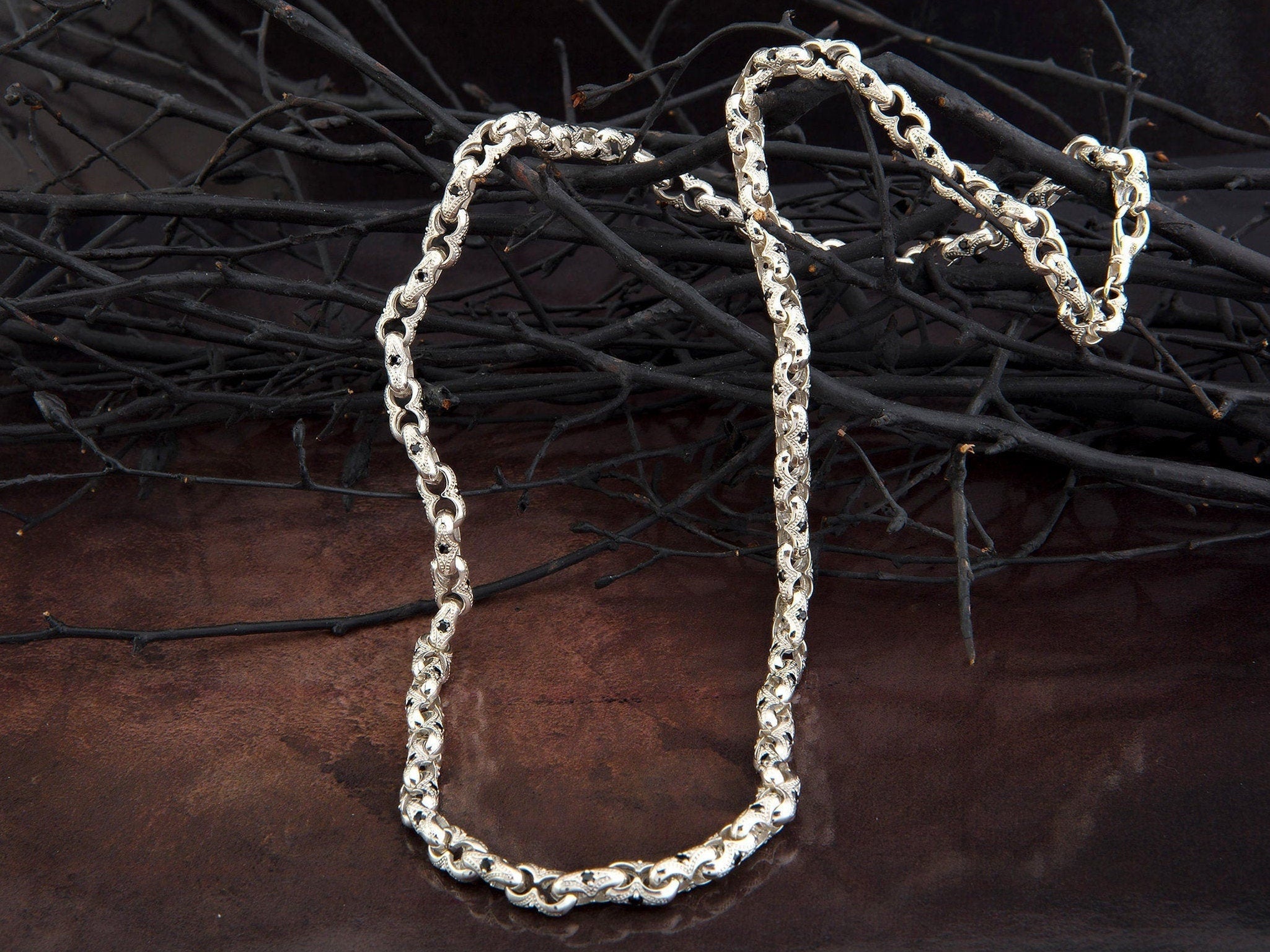 Chunky Chain Necklace, Byzantine Chain, Sterling Silver Handmade Men Necklace, Black Diamond Necklace For Man, Unique Gift For Father's Day