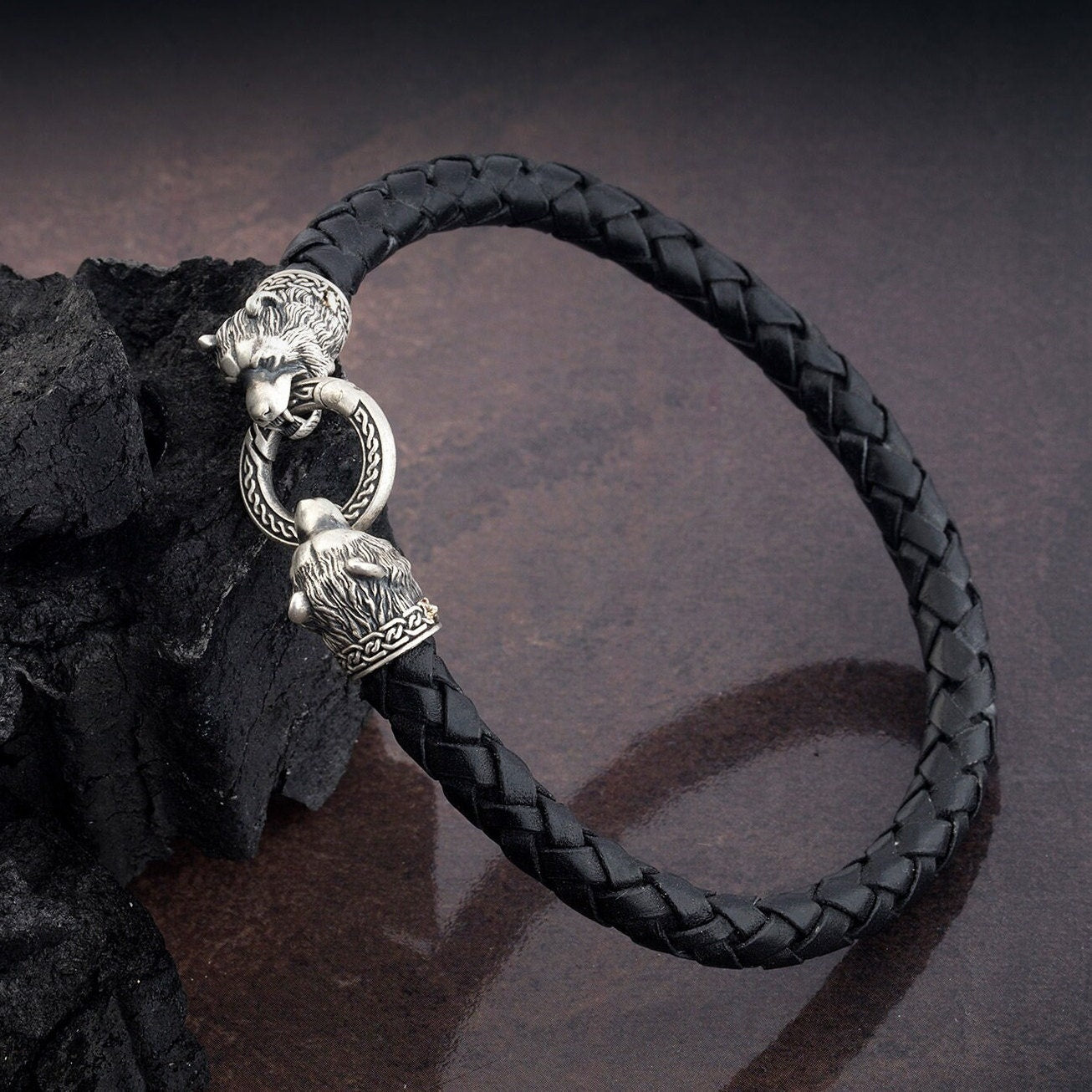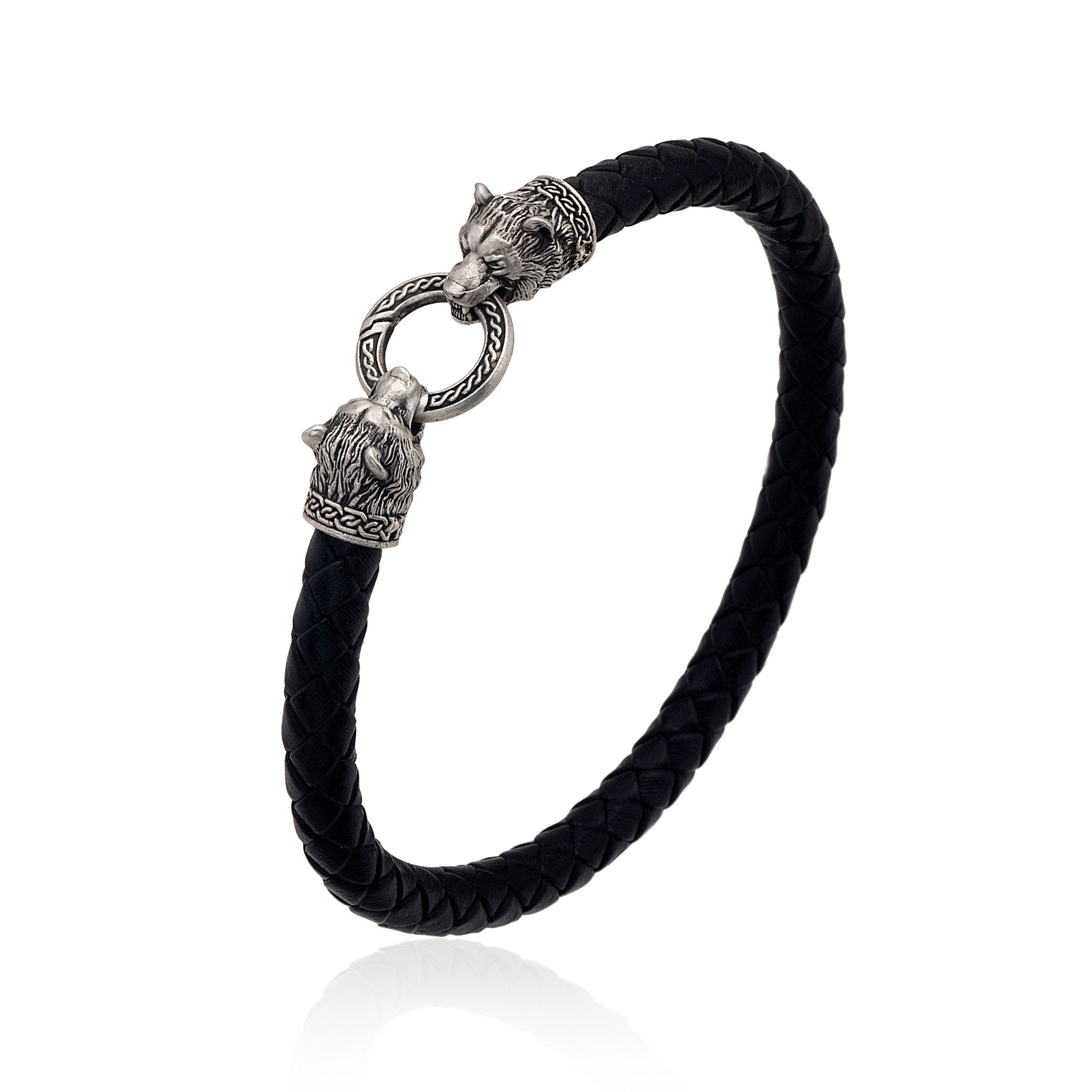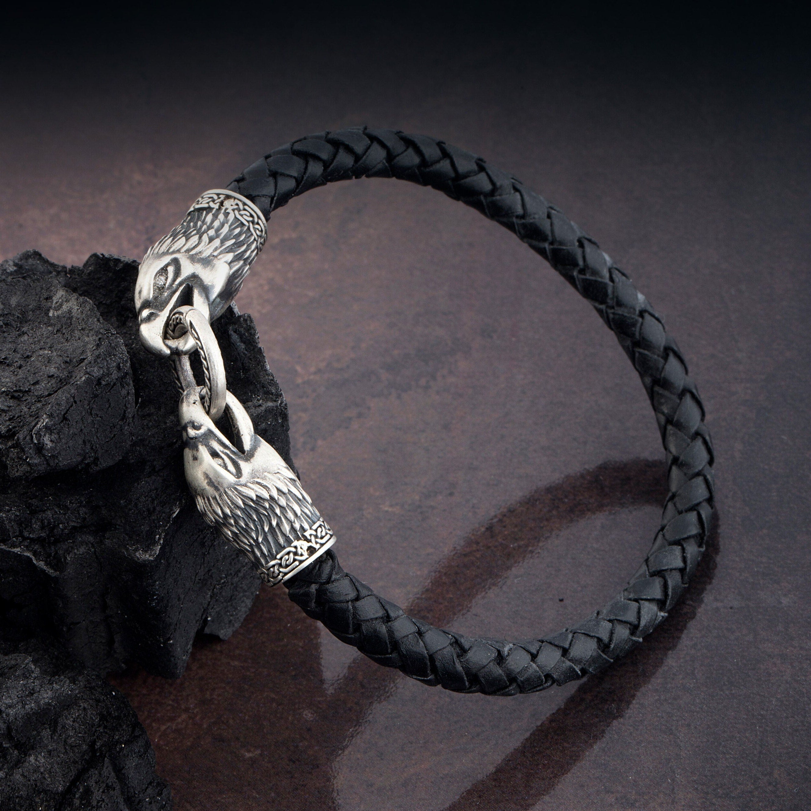 Men’s Black Braided Leather Bracelet with Sterling Silver Lion Heads