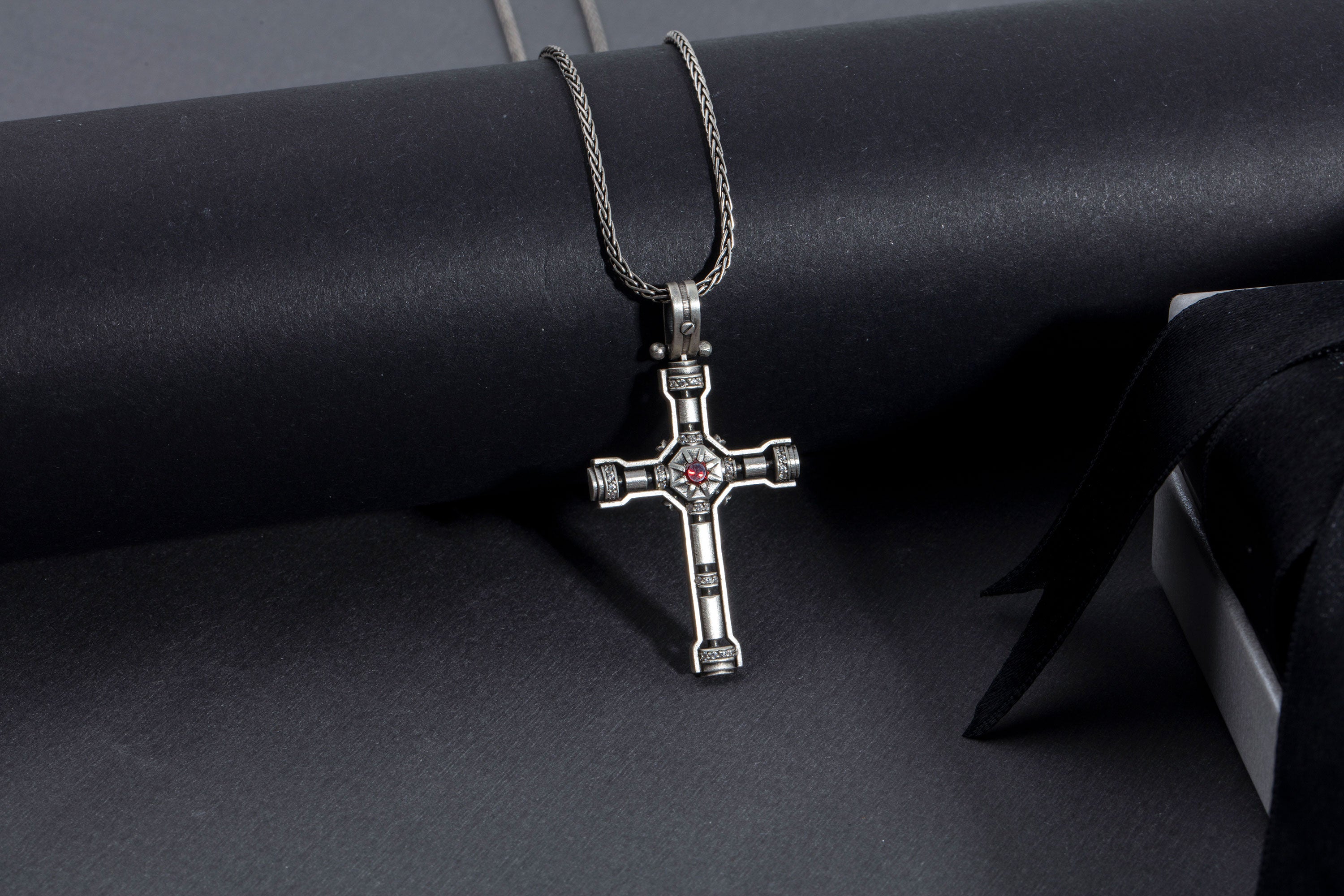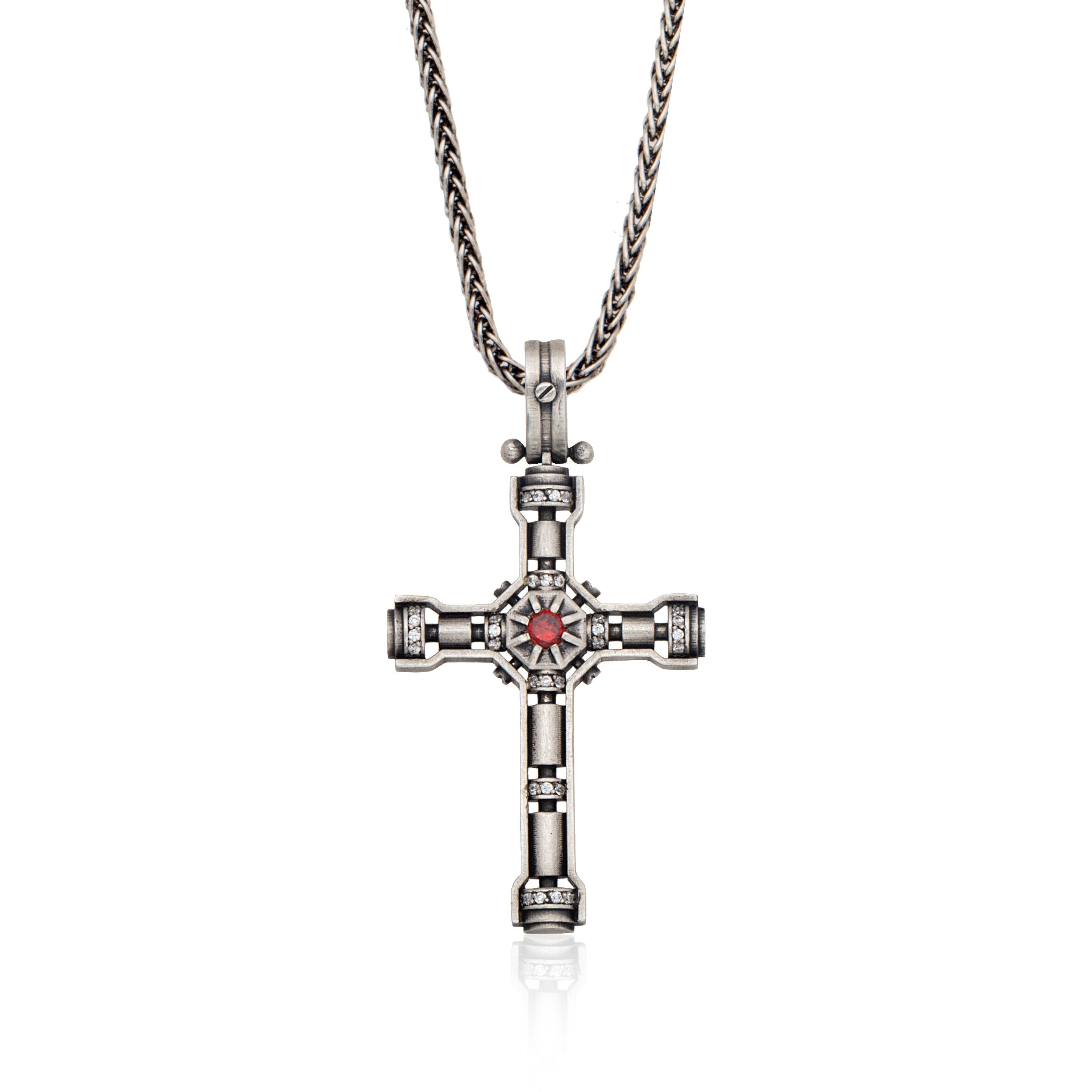 Men’s Sterling Silver Cross Necklace with Garnet & White Zircons
