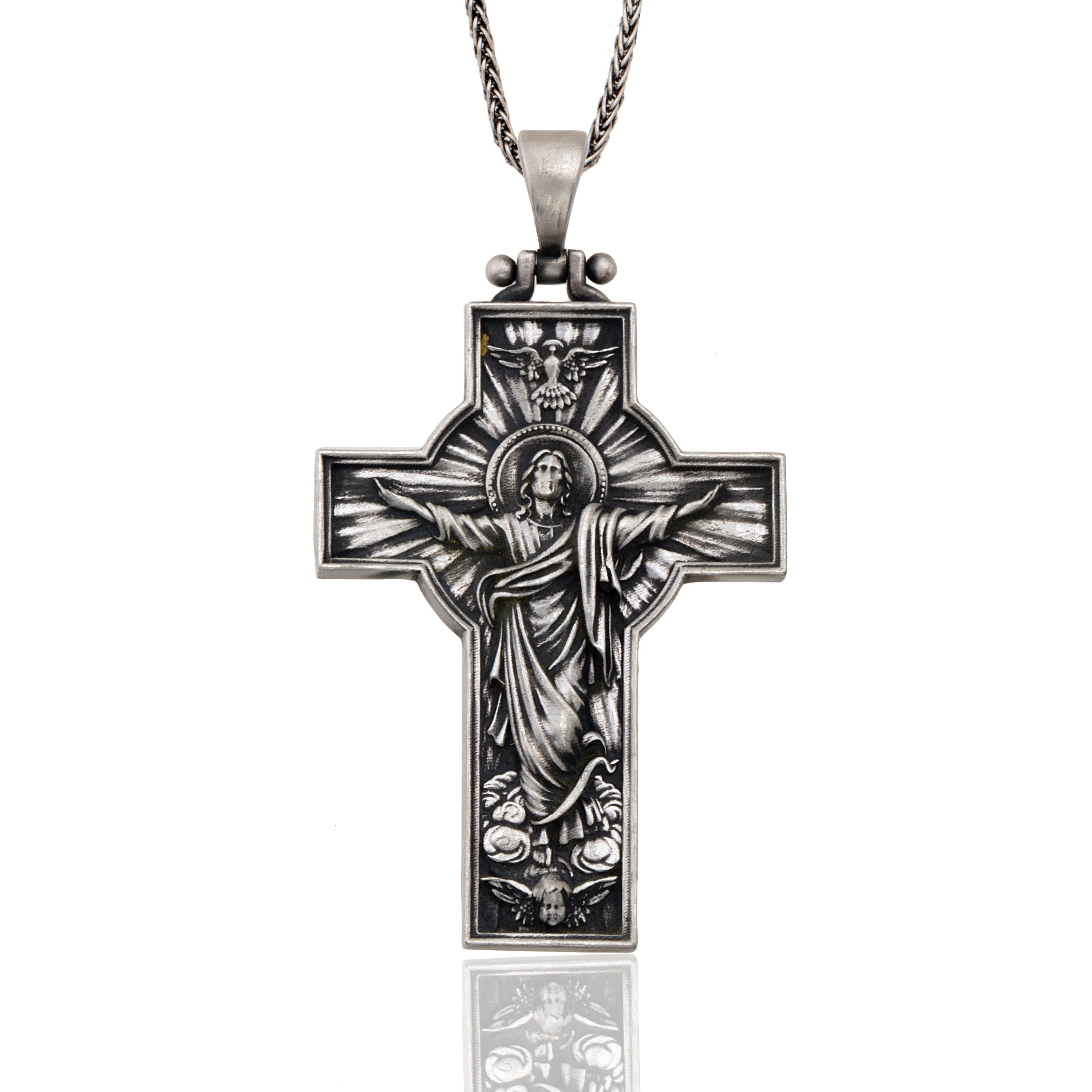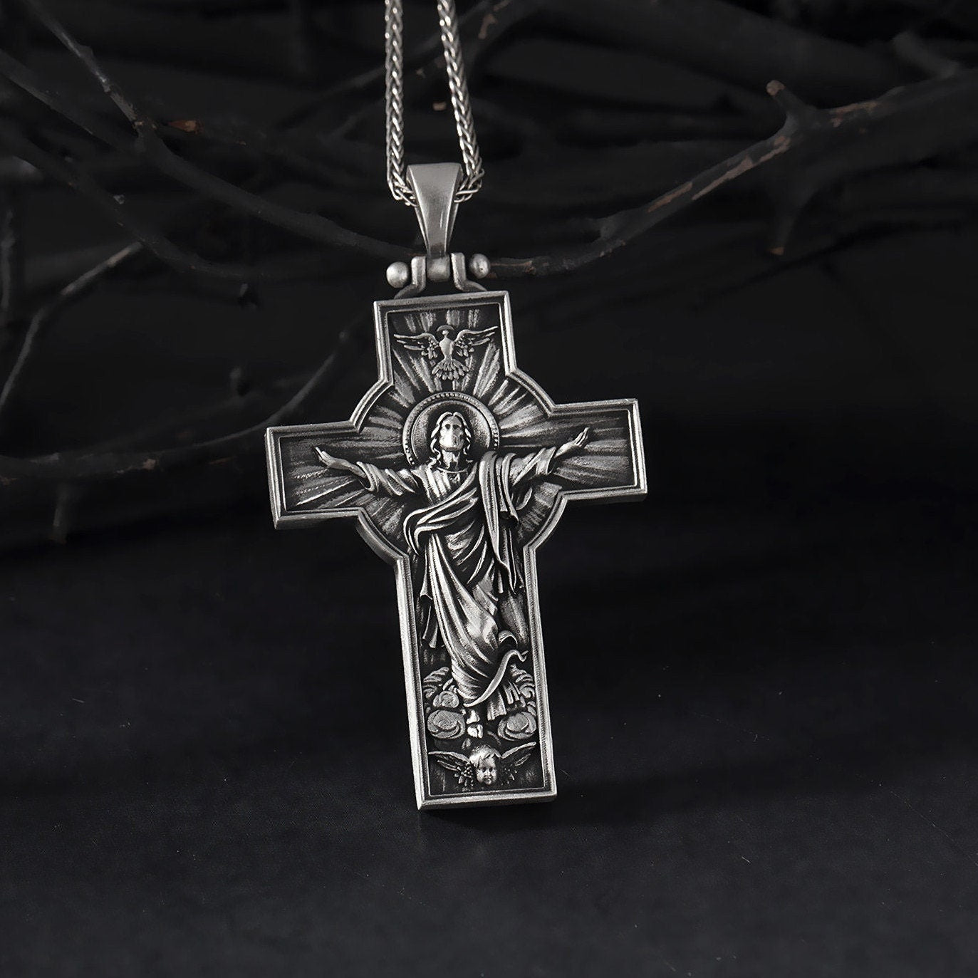 Sterling Silver Jesus Cross Necklace for Men - Risen Jesus Pendant