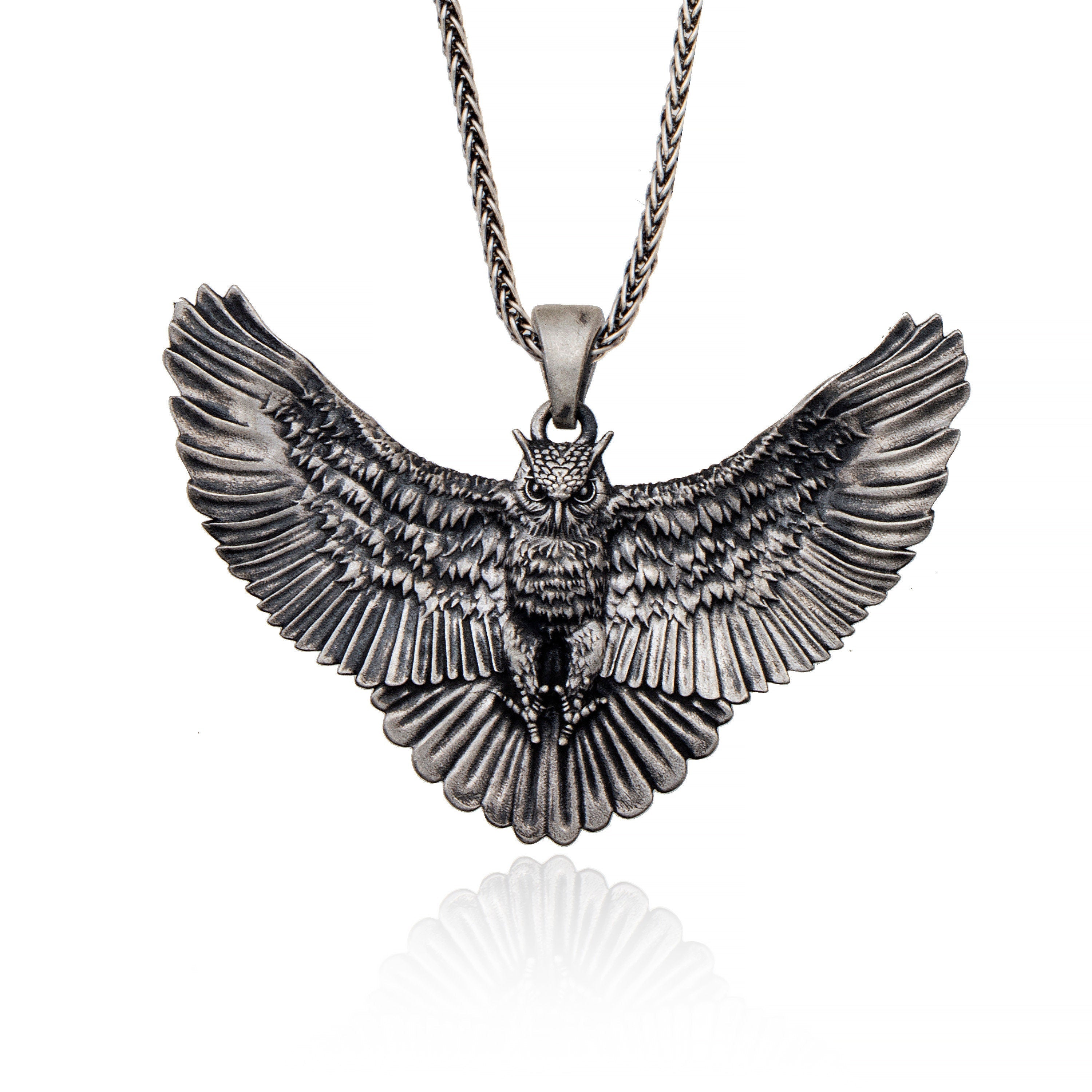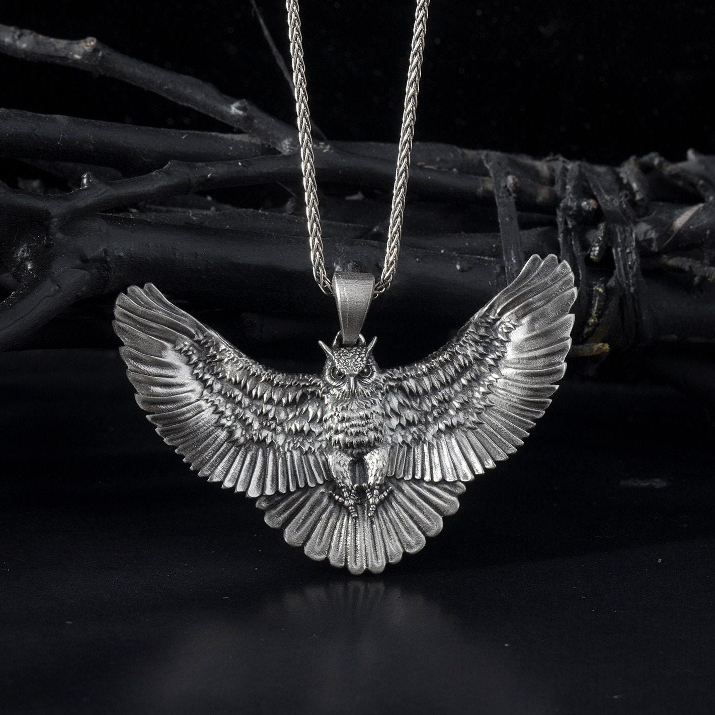 Solid Silver Owl Necklace, Owl Pendant, Animal Necklace, Gift For Mens, Winged Owl Necklace, Gift For Fathers, Unique Gift For Father's Day