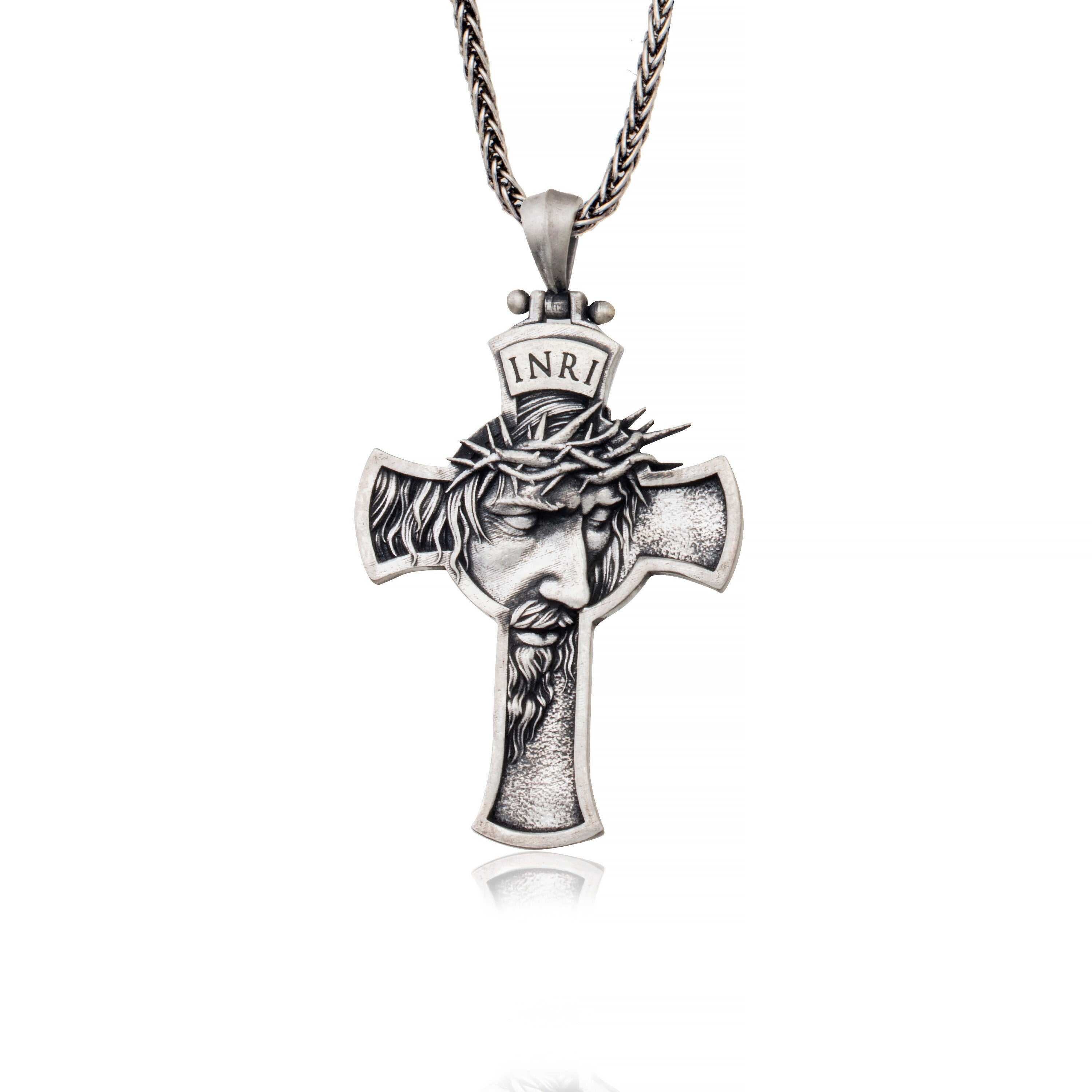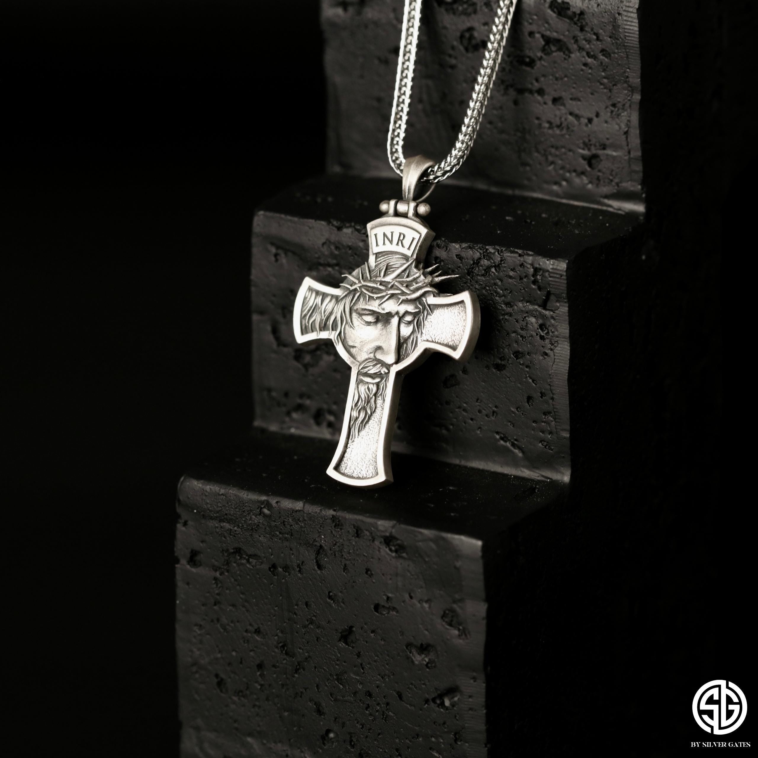 Men’s 925 Sterling Silver INRI Crucifix Necklace | Jesus Face Cross Pendant