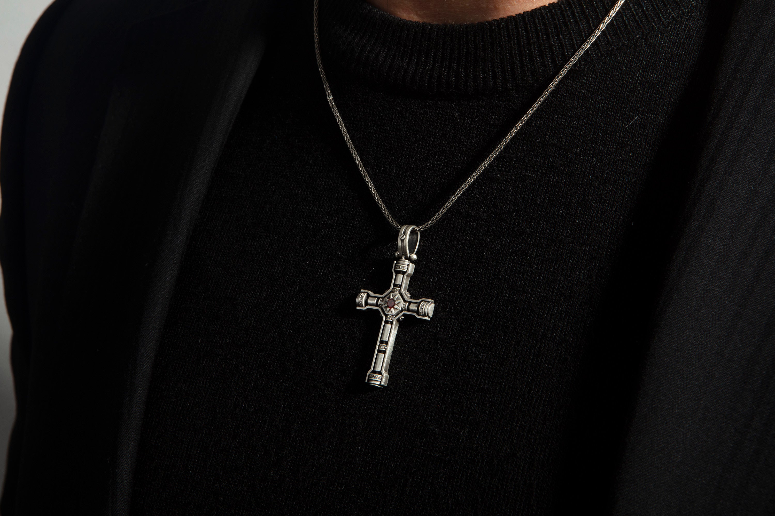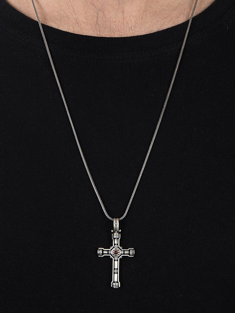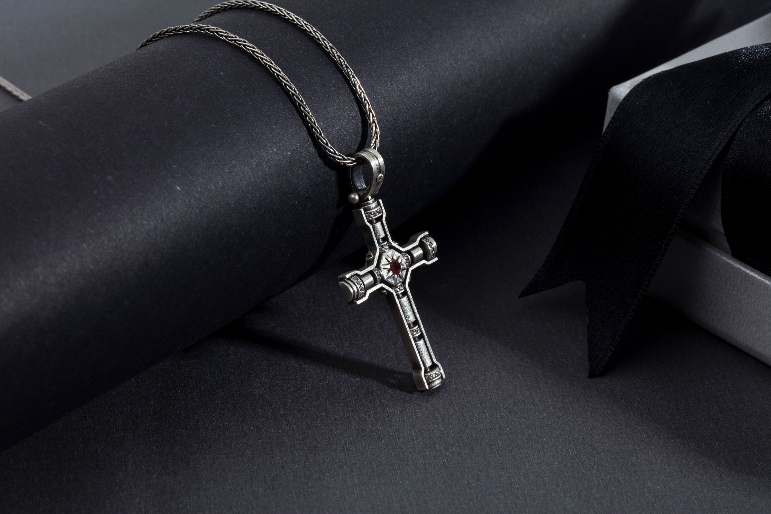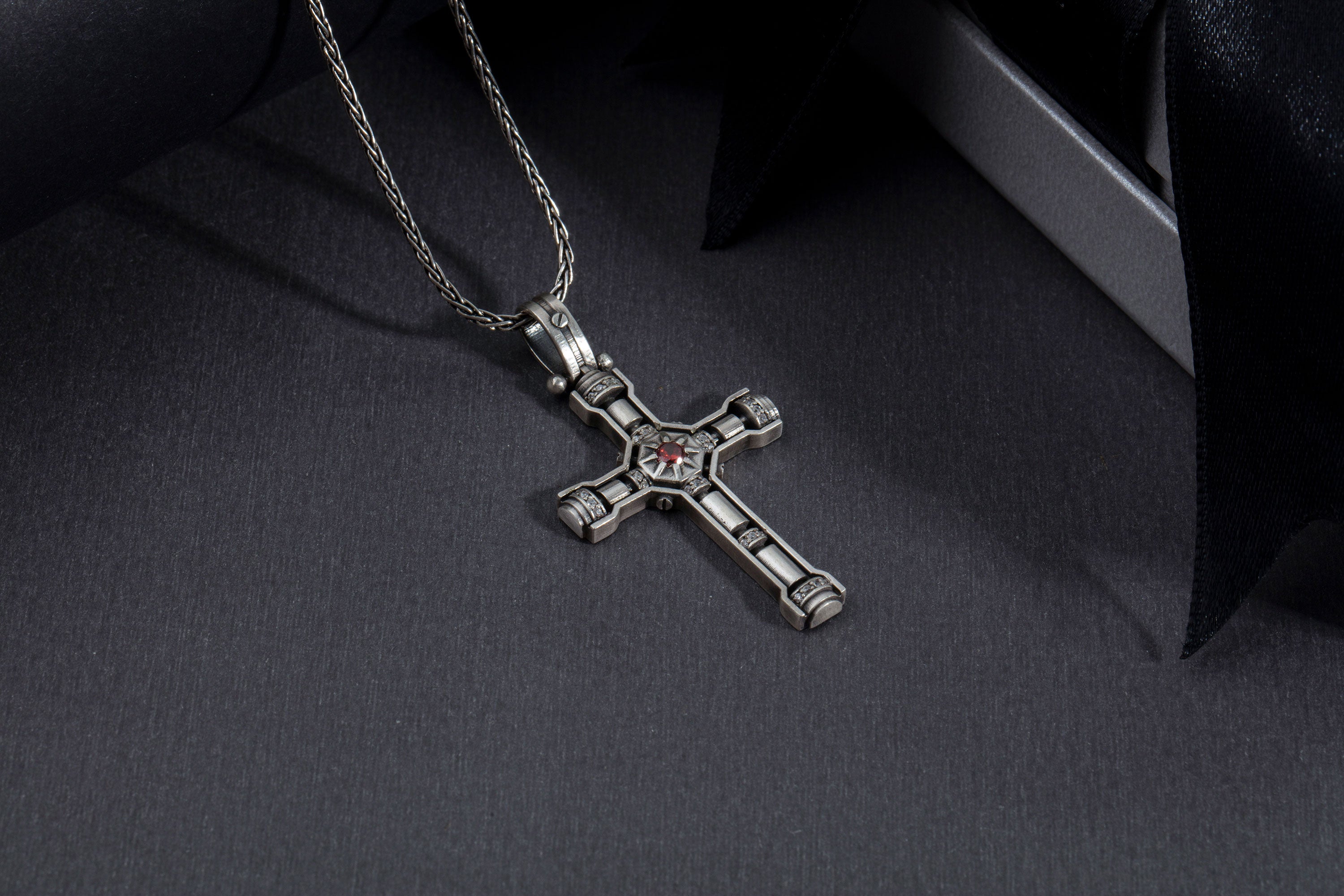 Elevate your style with this striking men’s cross necklace, expertly handcrafted from solid 925 sterling silver. Featuring intricate gothic-inspired details, the pendant is adorned with shimmering white zircon stones along the arms of the cross and a deep red garnet gemstone at its center — symbolizing strength, passion, and protection.