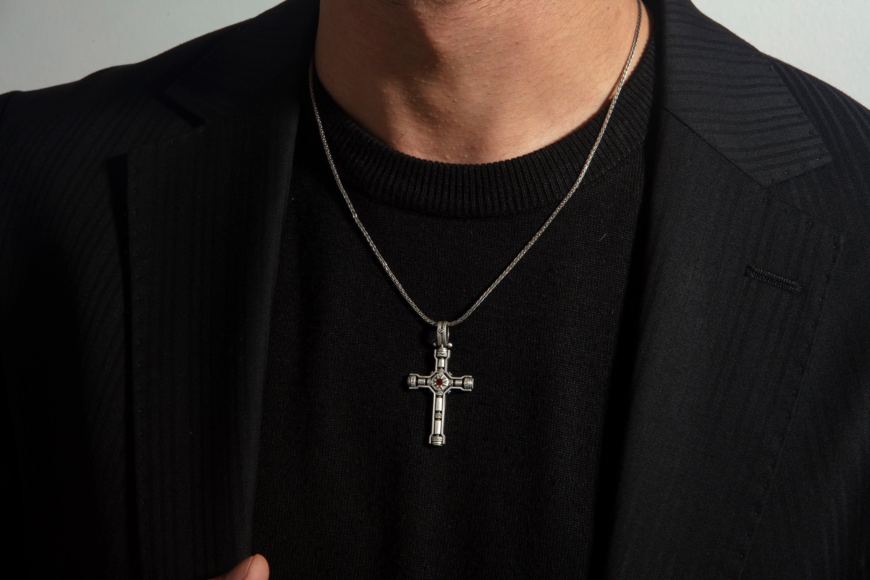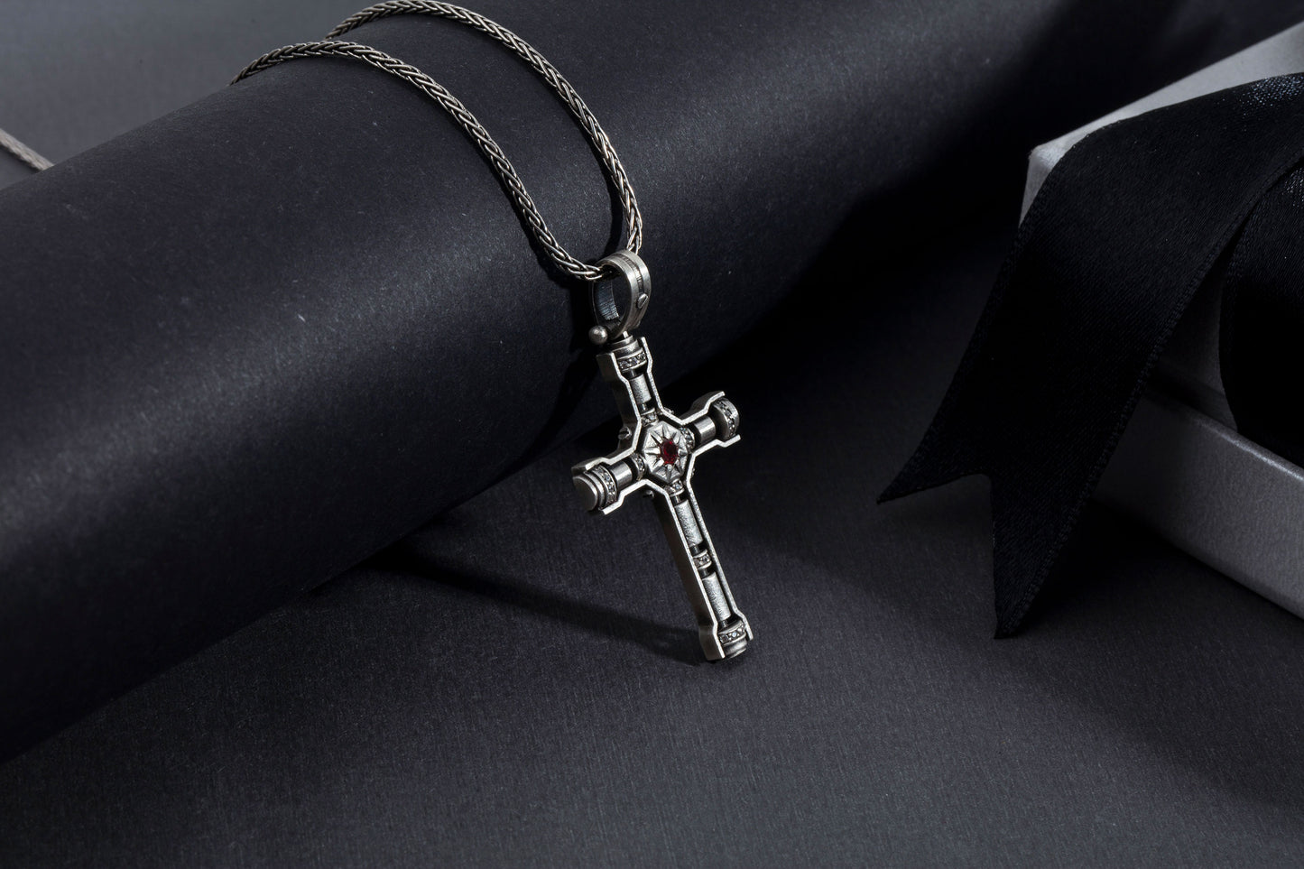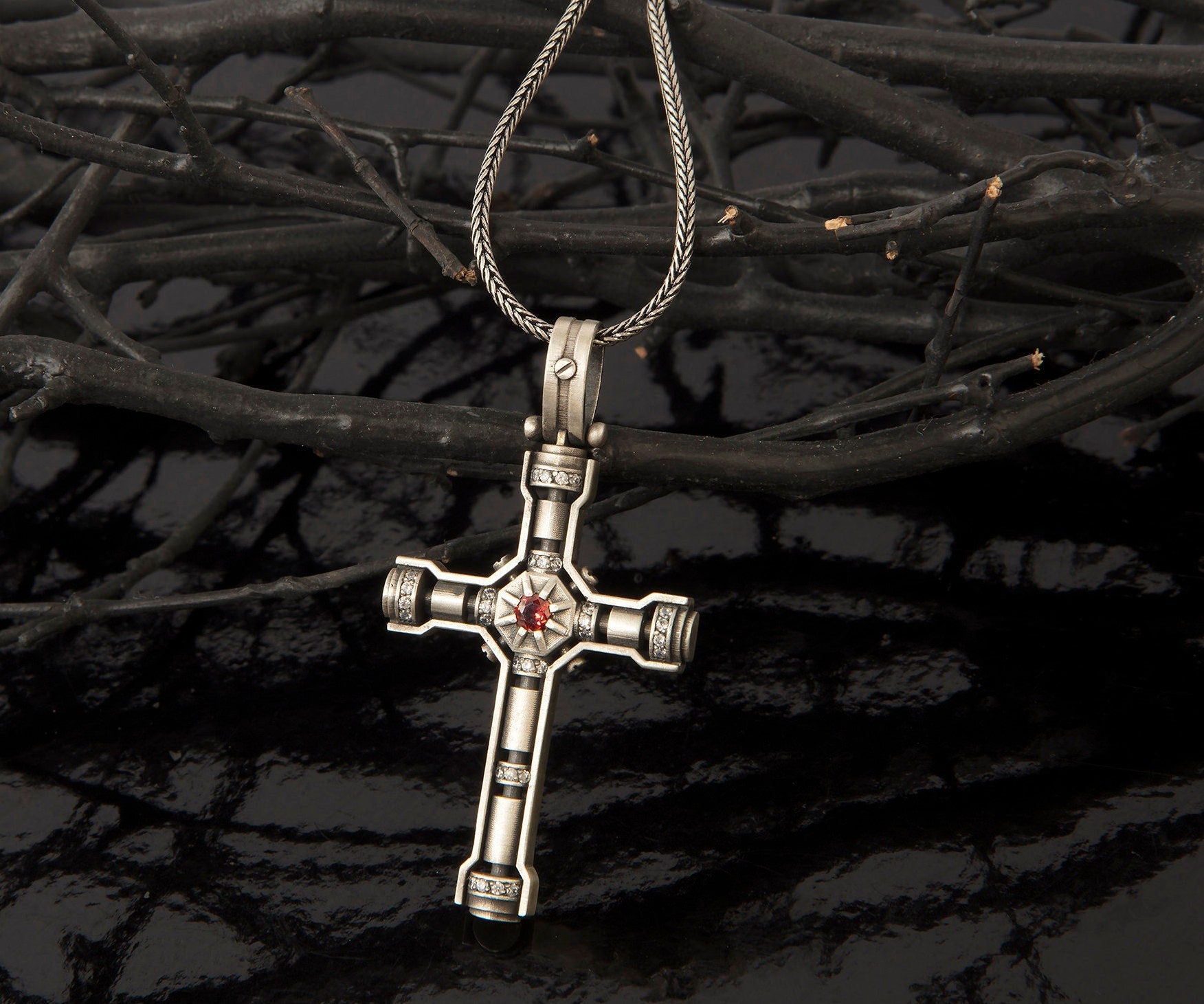 Men’s Sterling Silver Cross Necklace with Garnet & White Zircons