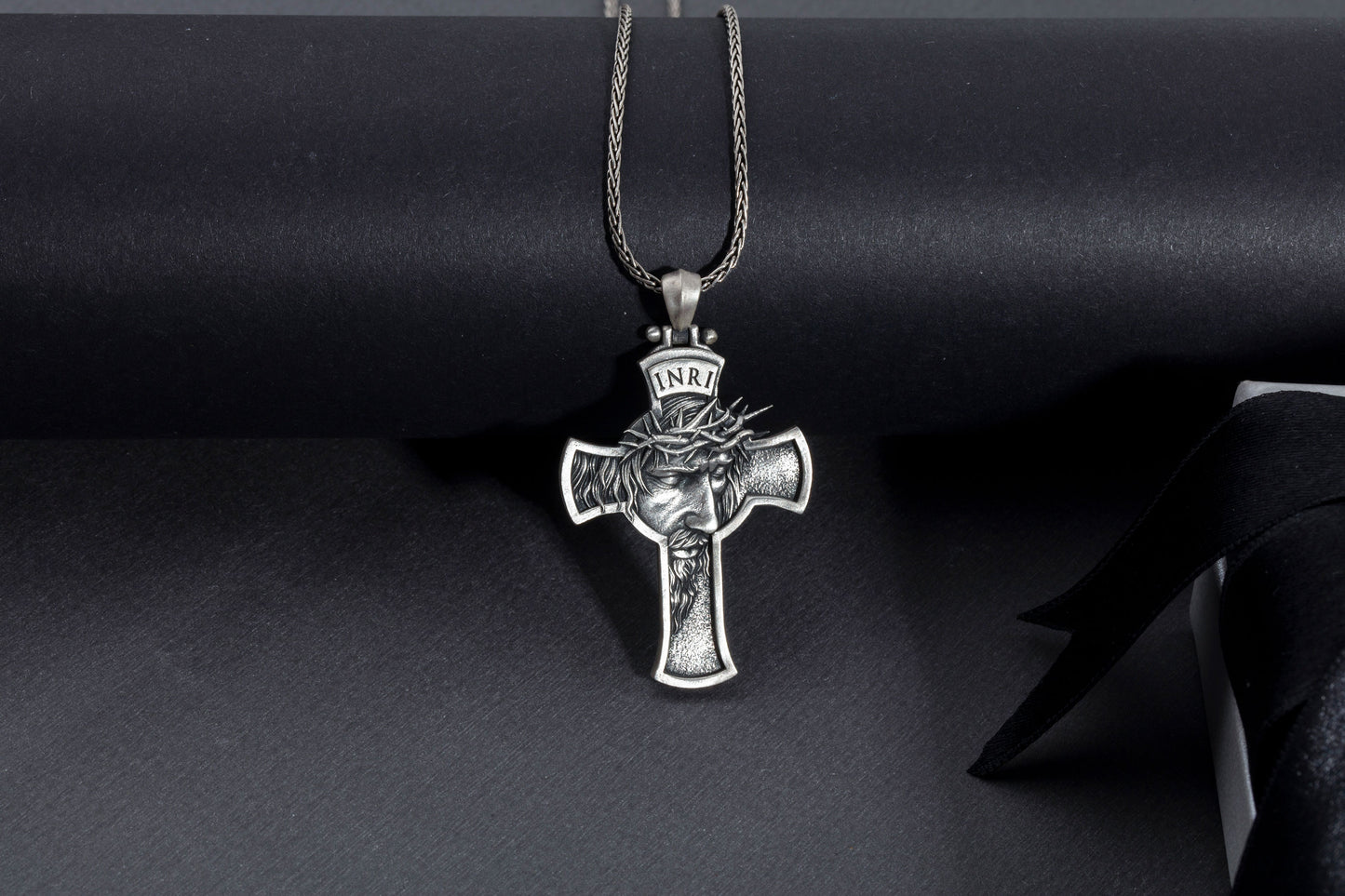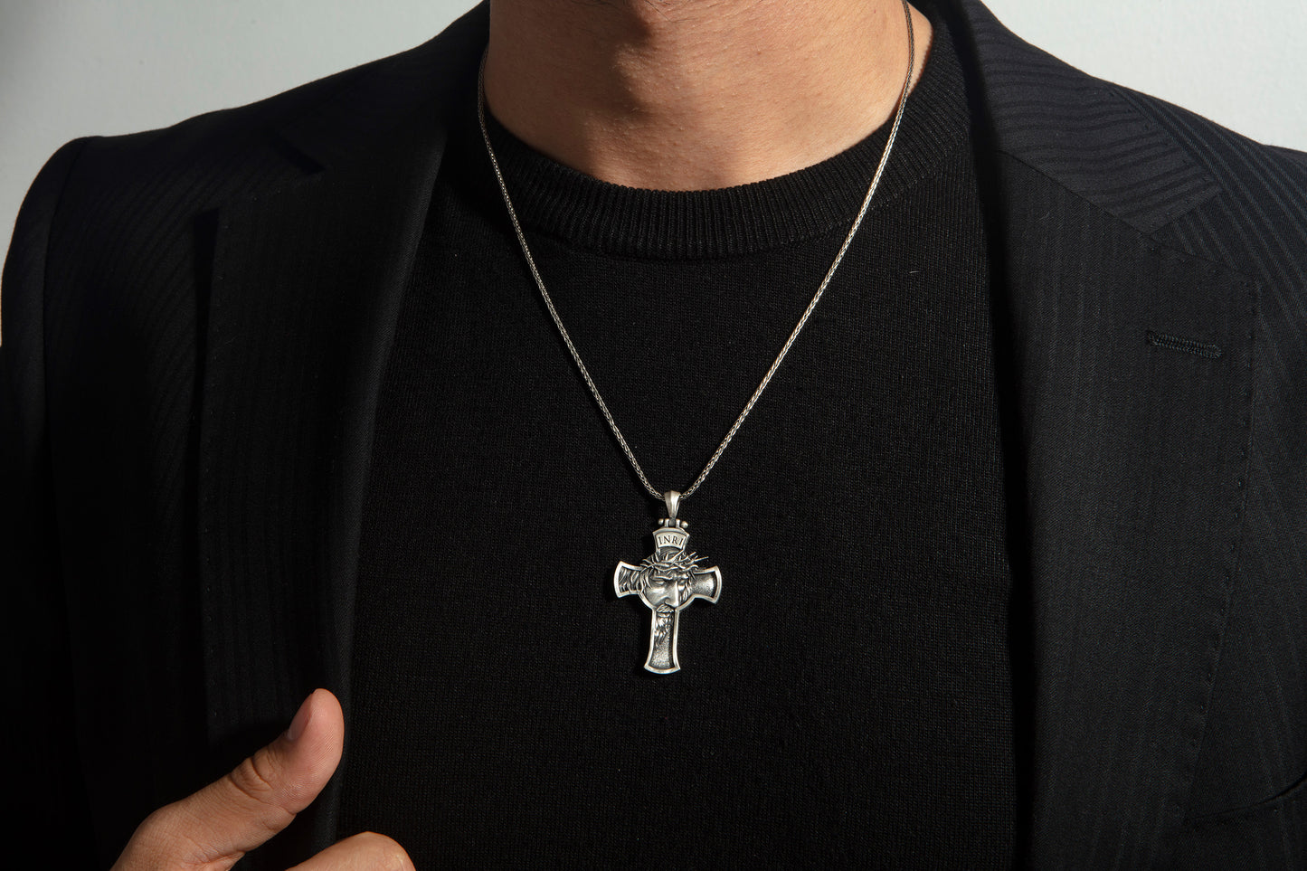 Make a bold statement of faith and style with this handcrafted INRI crucifix pendant, made from solid 925 sterling silver. Featuring a powerful relief of Jesus wearing the crown of thorns, this pendant symbolizes sacrifice and strength. The oxidized antique finish enhances every sculpted detail, giving it a striking and masculine character.