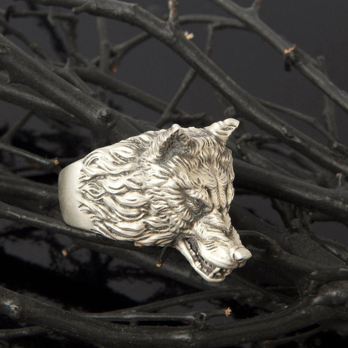 Silver Wolf Rings, Wild Angry Wolf Ring, Statement Men Rings, Oxidized Animal Rings, Wolf Head Statement Ring, Unique Gift For Father's Day