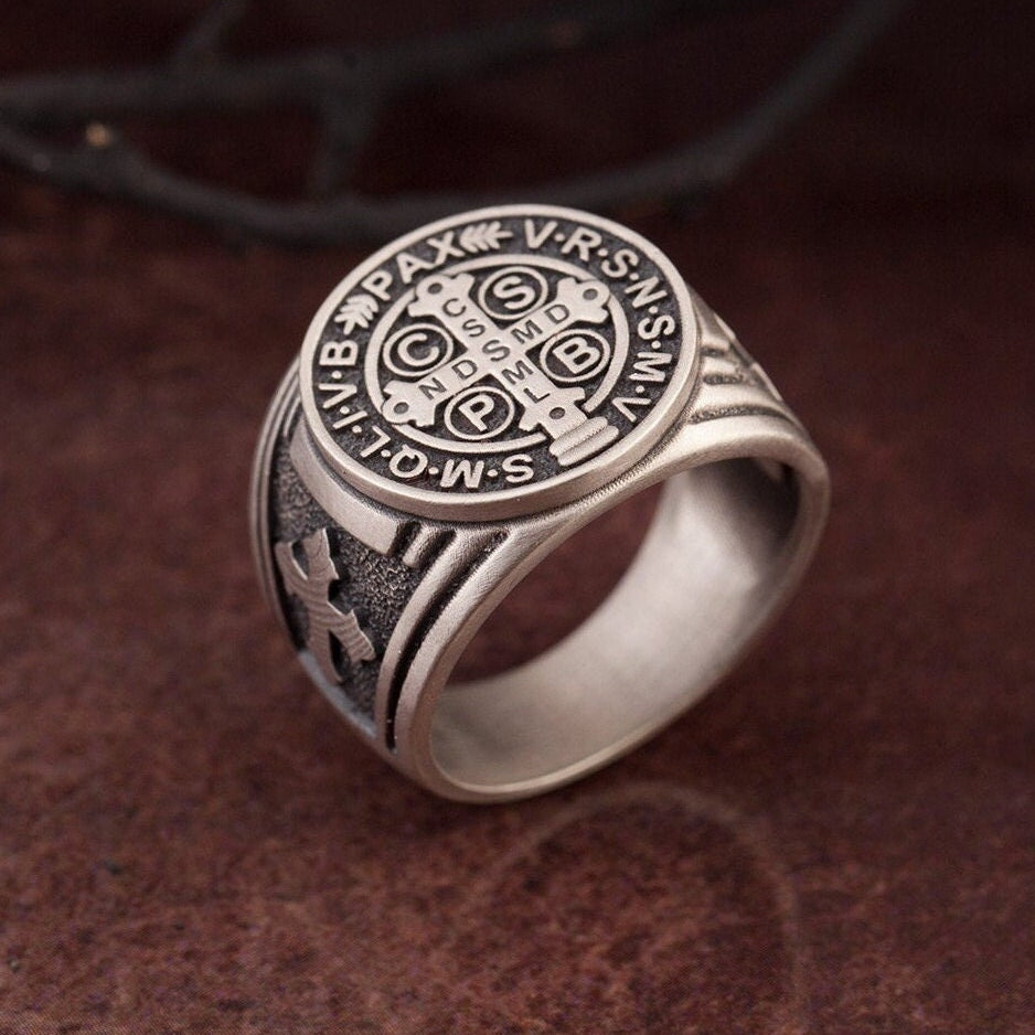 St Benedict Medal Cross Ring, Silver Signet Man Ring, Men's Religious Jewelry, St Benedict Ring, Ring For Men, Unique Gift For Father's Day