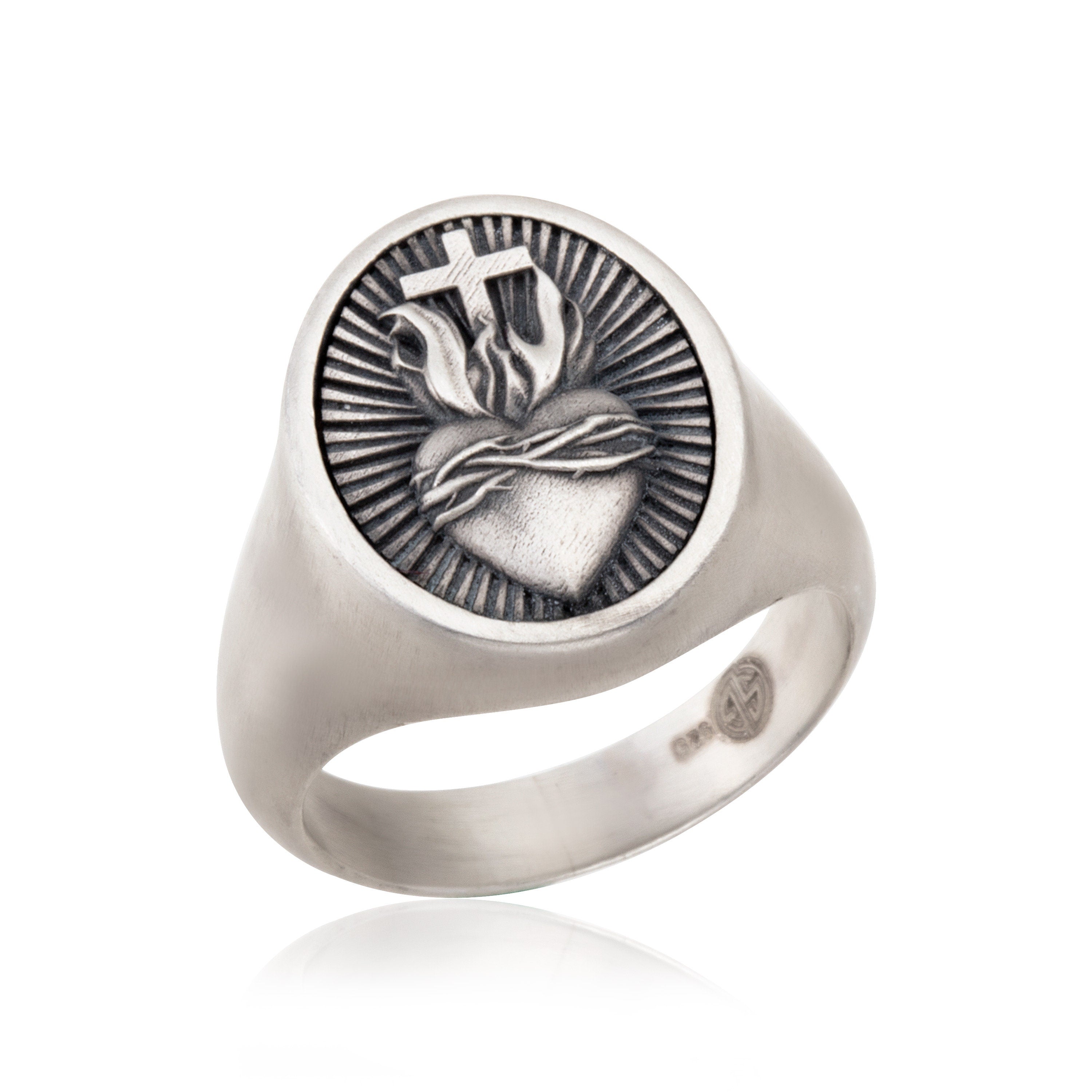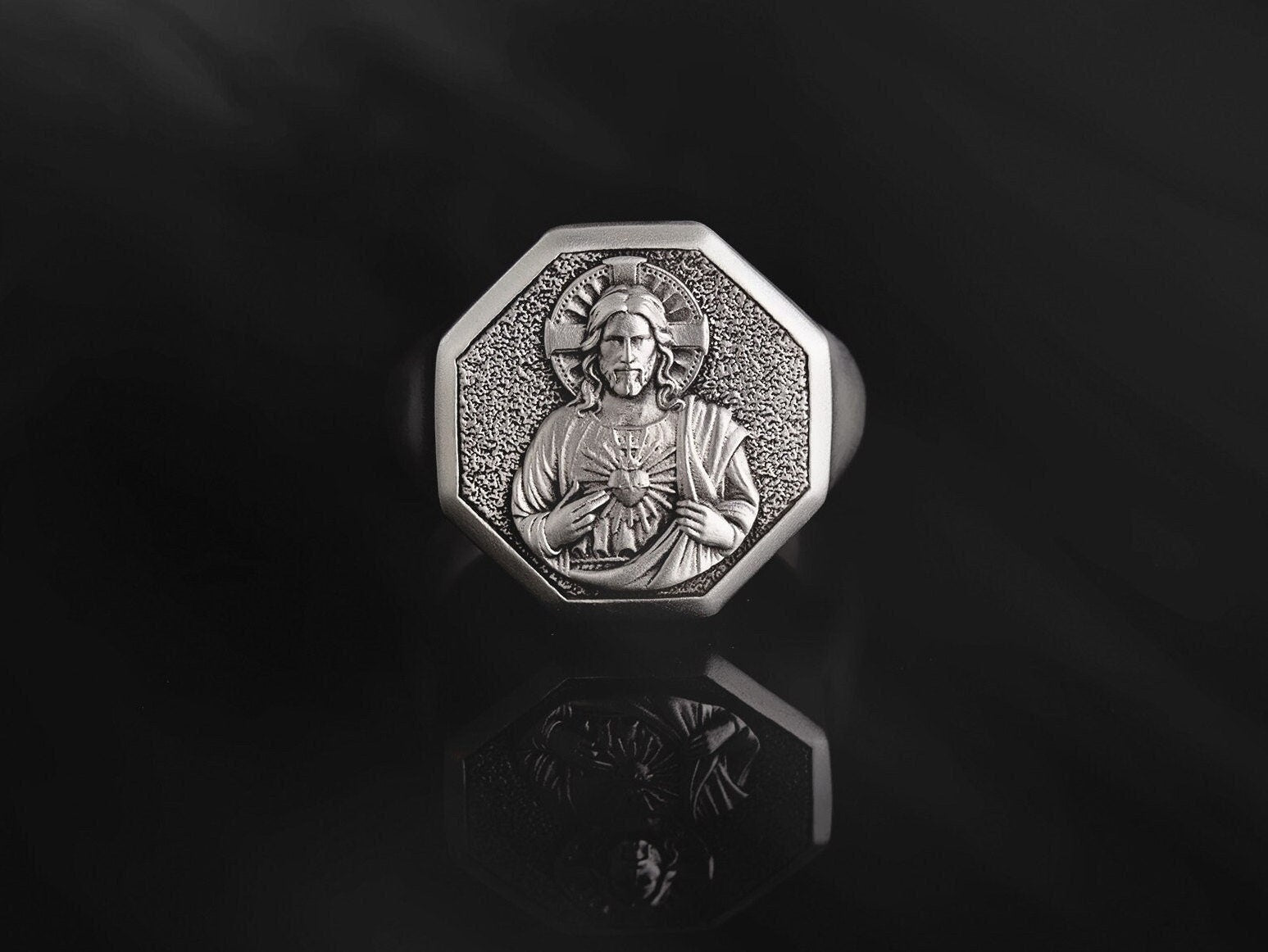 Silver Sacred Heart Man Ring, Crucifix Statement Rings, Men's Religious Jewelry, Birthday Gifts For Husbands, Unique Gift For Father's Day