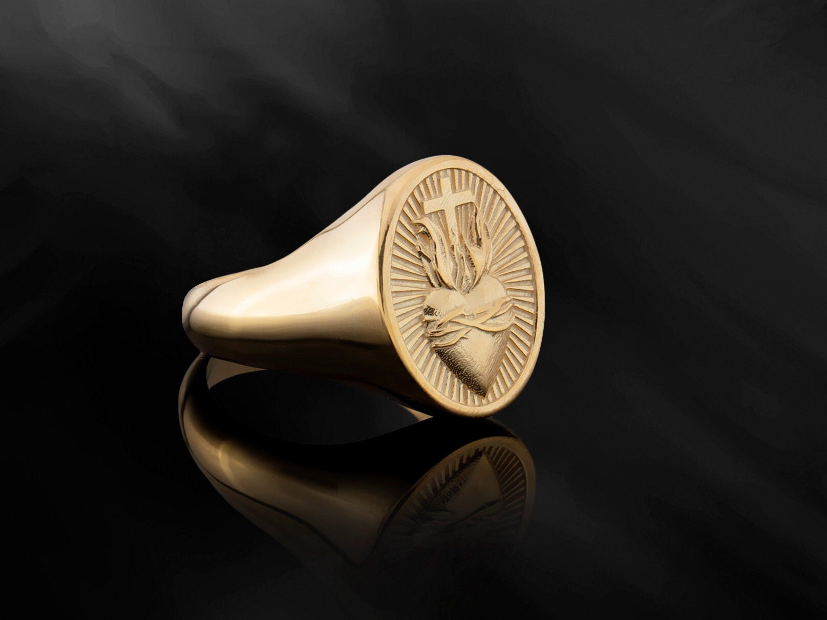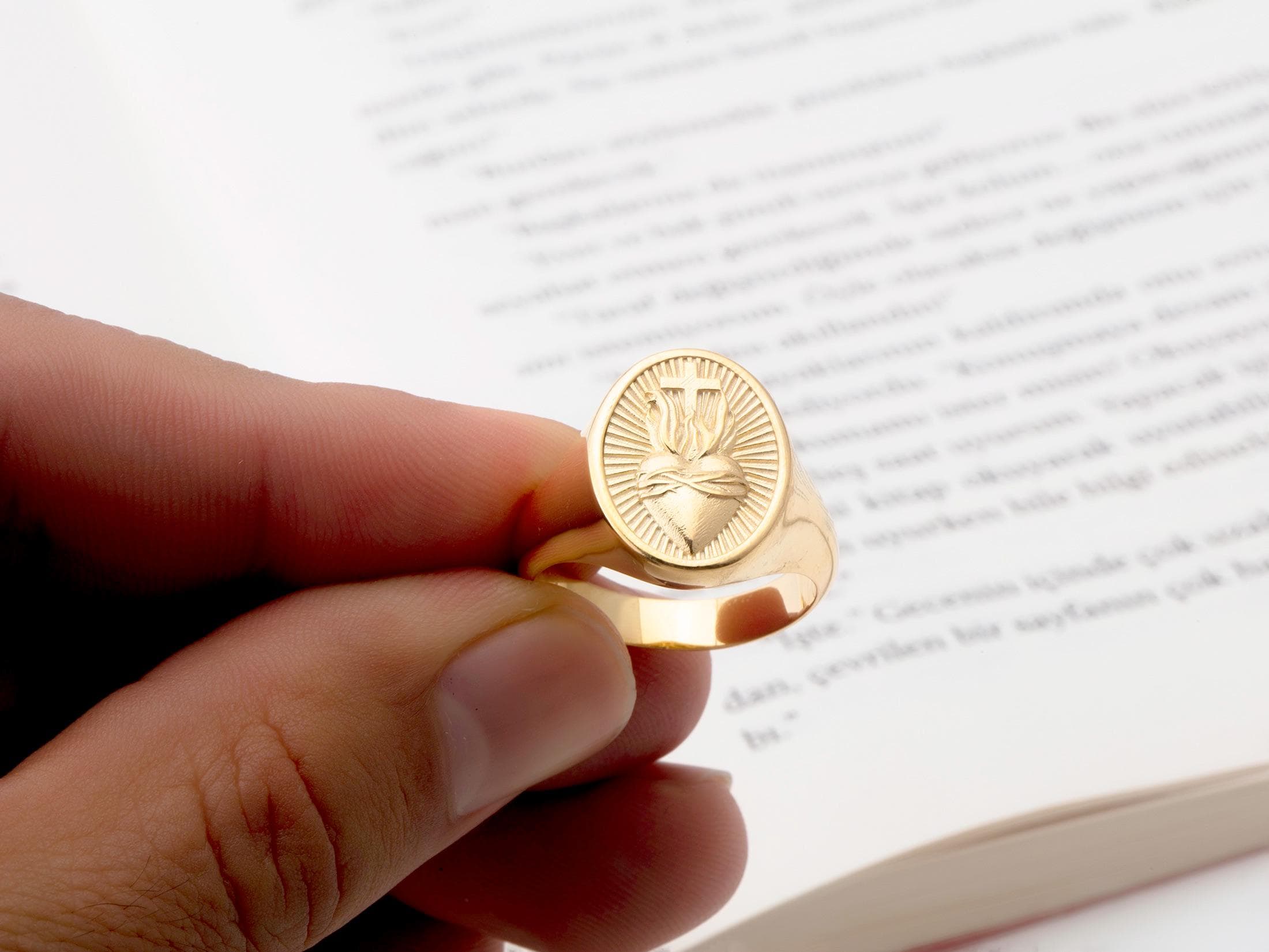 Elevate your style and faith with our Gold Cross Signet Ring with Sacred Heart design. Handcrafted with precision, this timeless ring is available in 10K, 14K, and 18K solid gold options. Featuring a bold Sacred Heart and Cross engraving, it symbolizes devotion, strength, and eternal faith. Perfect as a meaningful gift for him, this Christian men’s jewelry piece makes a lasting statement of belief and elegance. Ideal for anniversaries, religious celebrations, or as a unique heirloom.