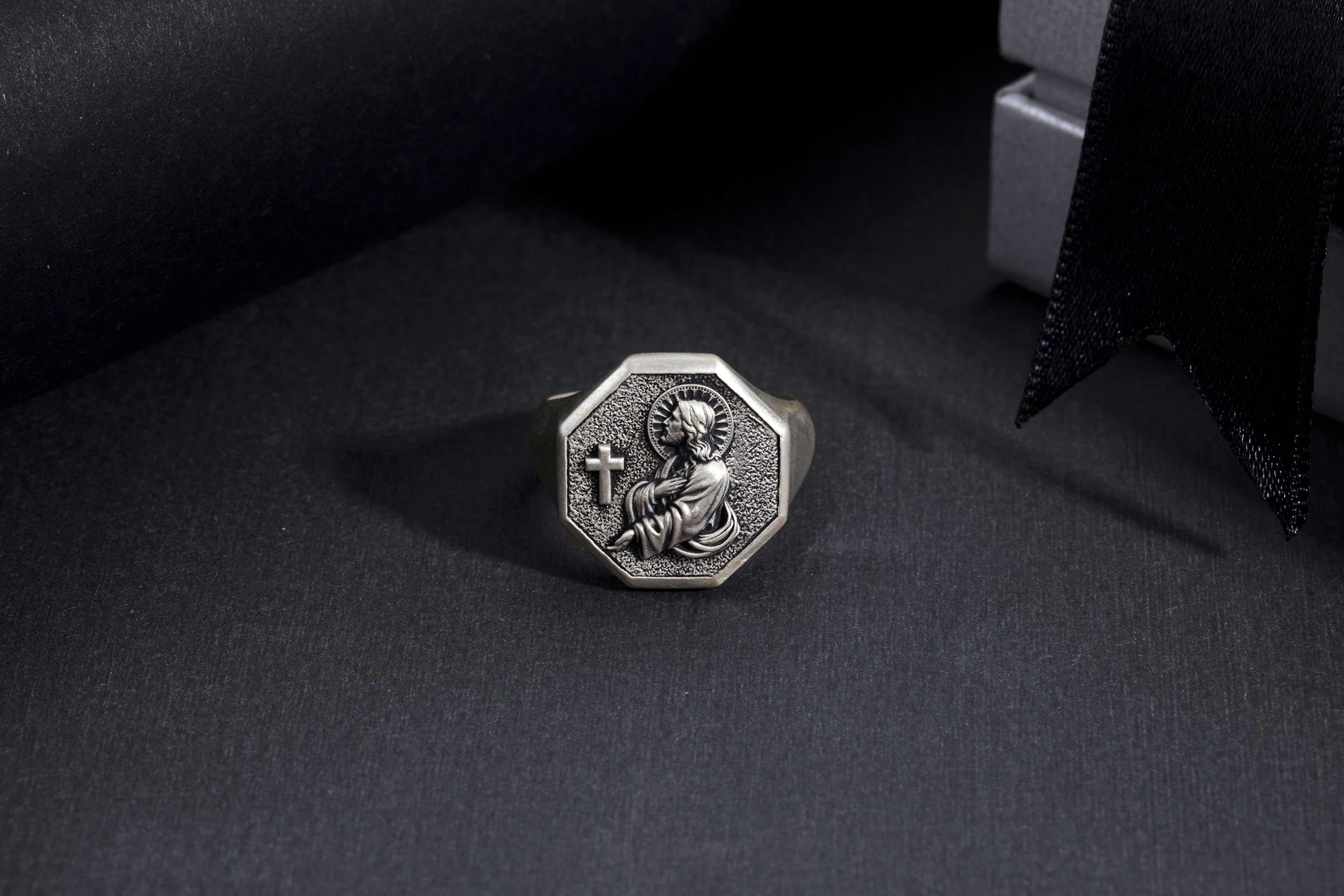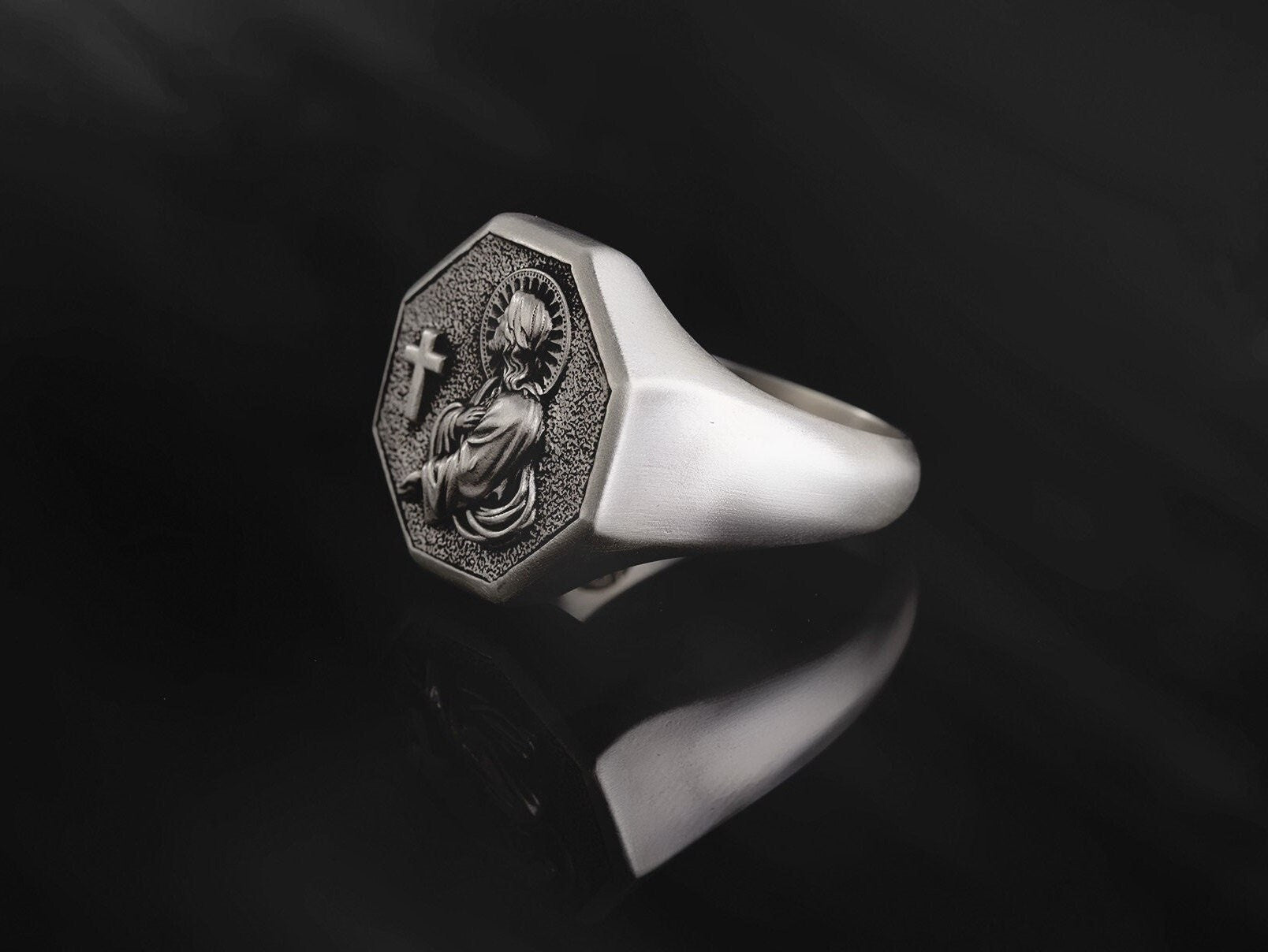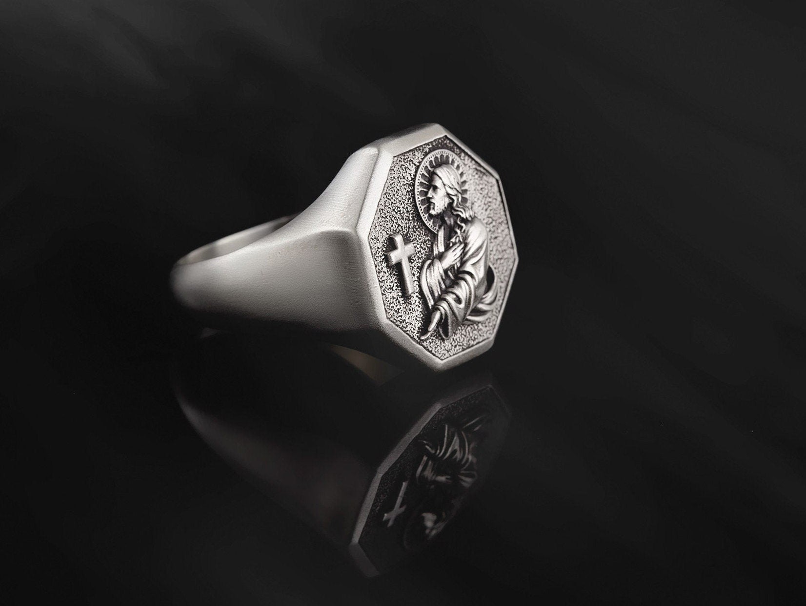 Embrace faith and timeless craftsmanship with this 925 Sterling Silver Jesus & Cross Octagon Statement Ring. Featuring a detailed depiction of Jesus alongside a cross, framed in an octagon design, this ring symbolizes devotion, strength, and spiritual protection. Handcrafted from solid sterling silver, it is durable, hypoallergenic, and designed for everyday wear. Perfect as a meaningful gift for men of faith, or as a bold statement piece that reflects your spiritual journey.