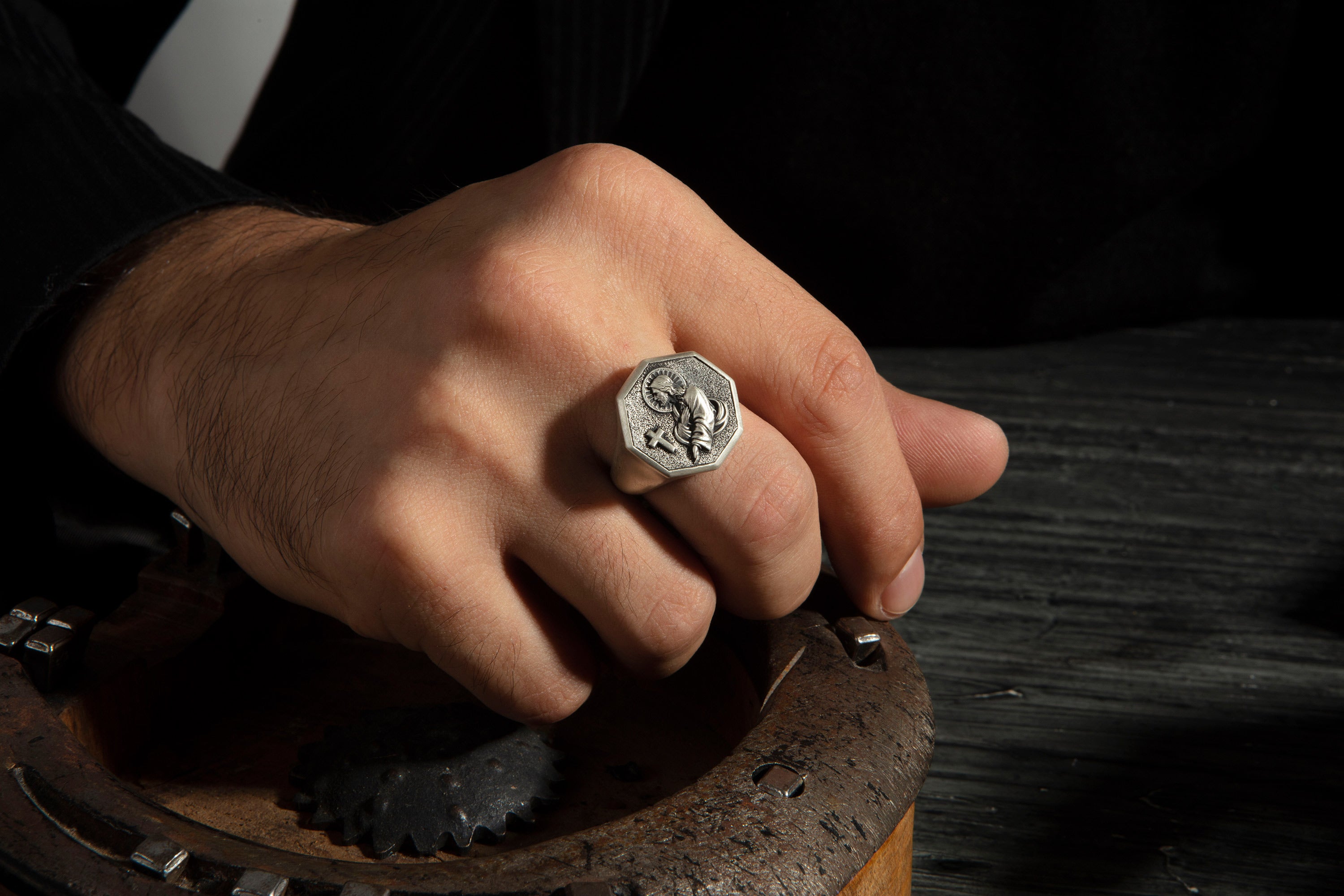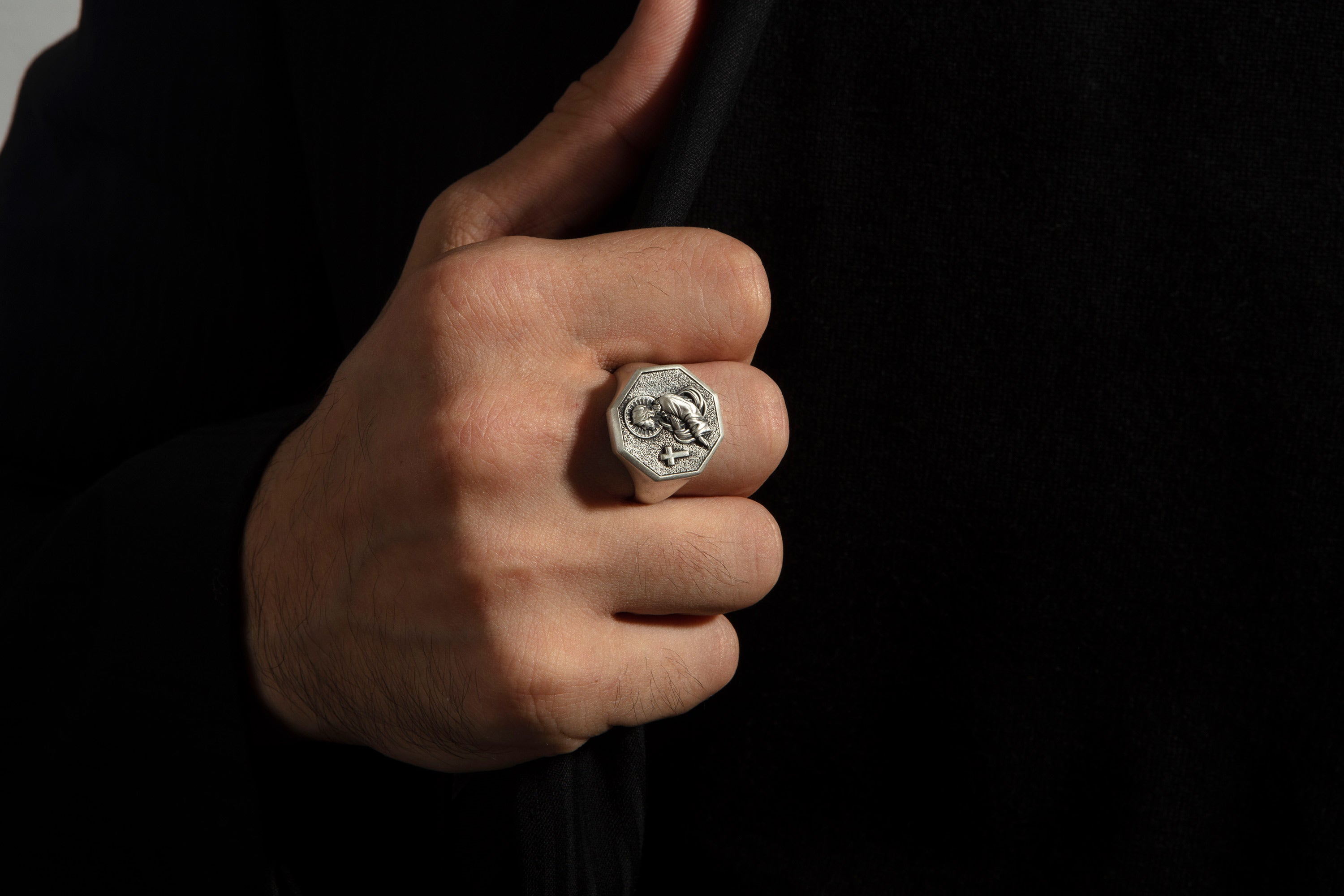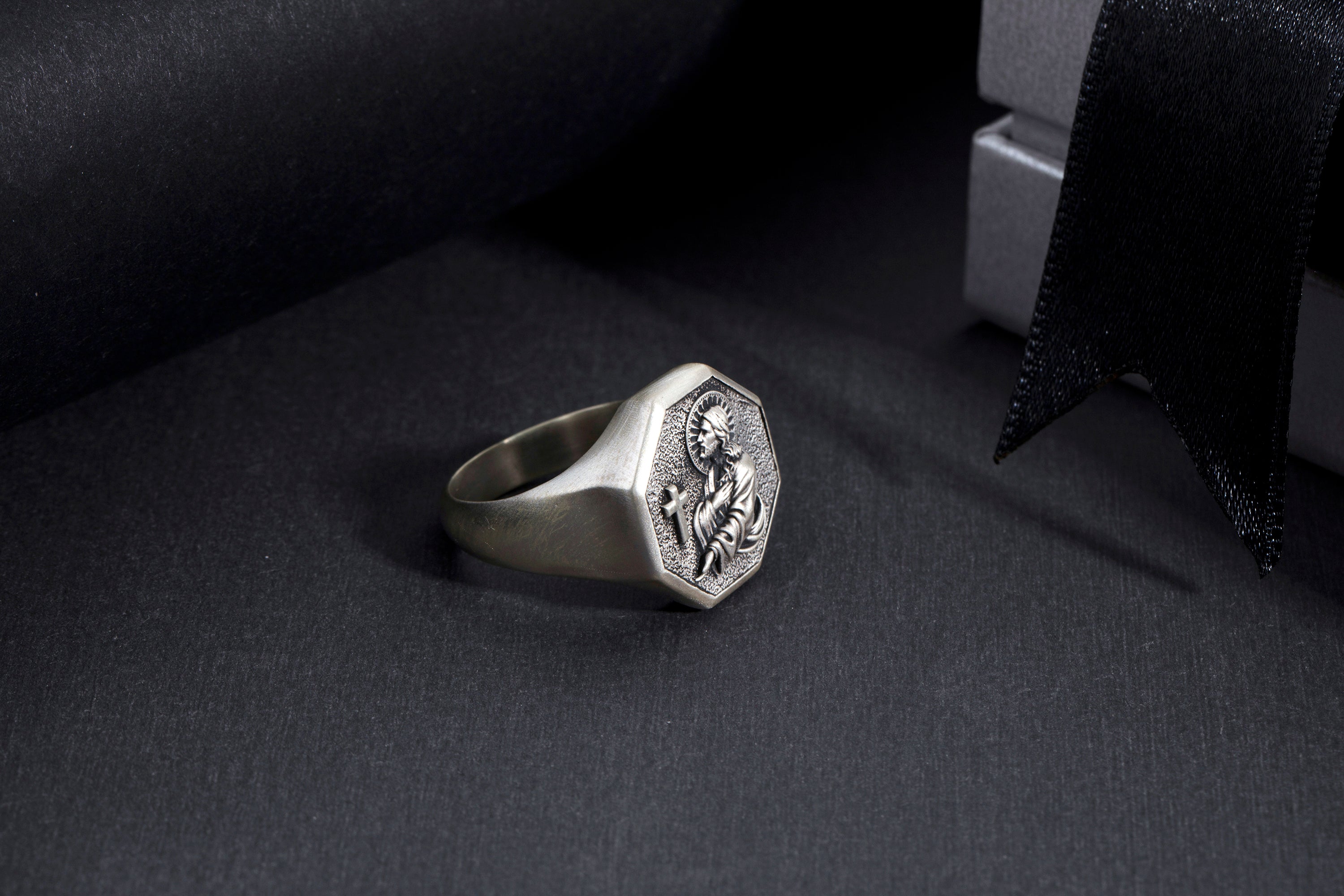 Embrace faith and timeless craftsmanship with this 925 Sterling Silver Jesus & Cross Octagon Statement Ring. Featuring a detailed depiction of Jesus alongside a cross, framed in an octagon design, this ring symbolizes devotion, strength, and spiritual protection. Handcrafted from solid sterling silver, it is durable, hypoallergenic, and designed for everyday wear. Perfect as a meaningful gift for men of faith, or as a bold statement piece that reflects your spiritual journey.