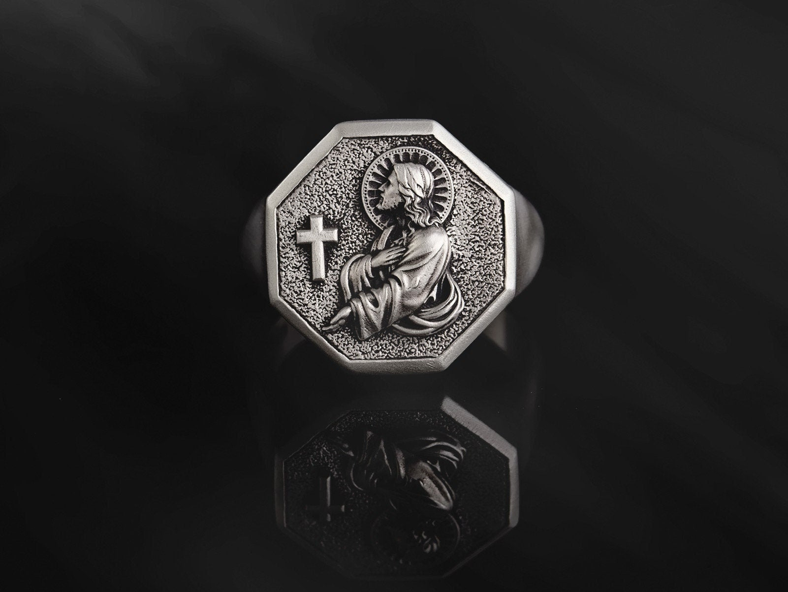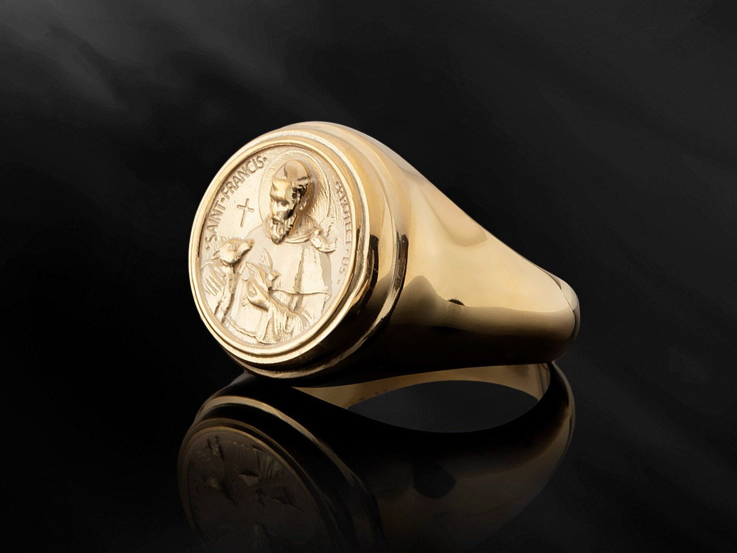 14K Solid Gold Saint Francis Ring, 18K Religious Statement Ring, Catholic Men's Rings, St Francis Signet Ring, Unique Gift For Father's Day
