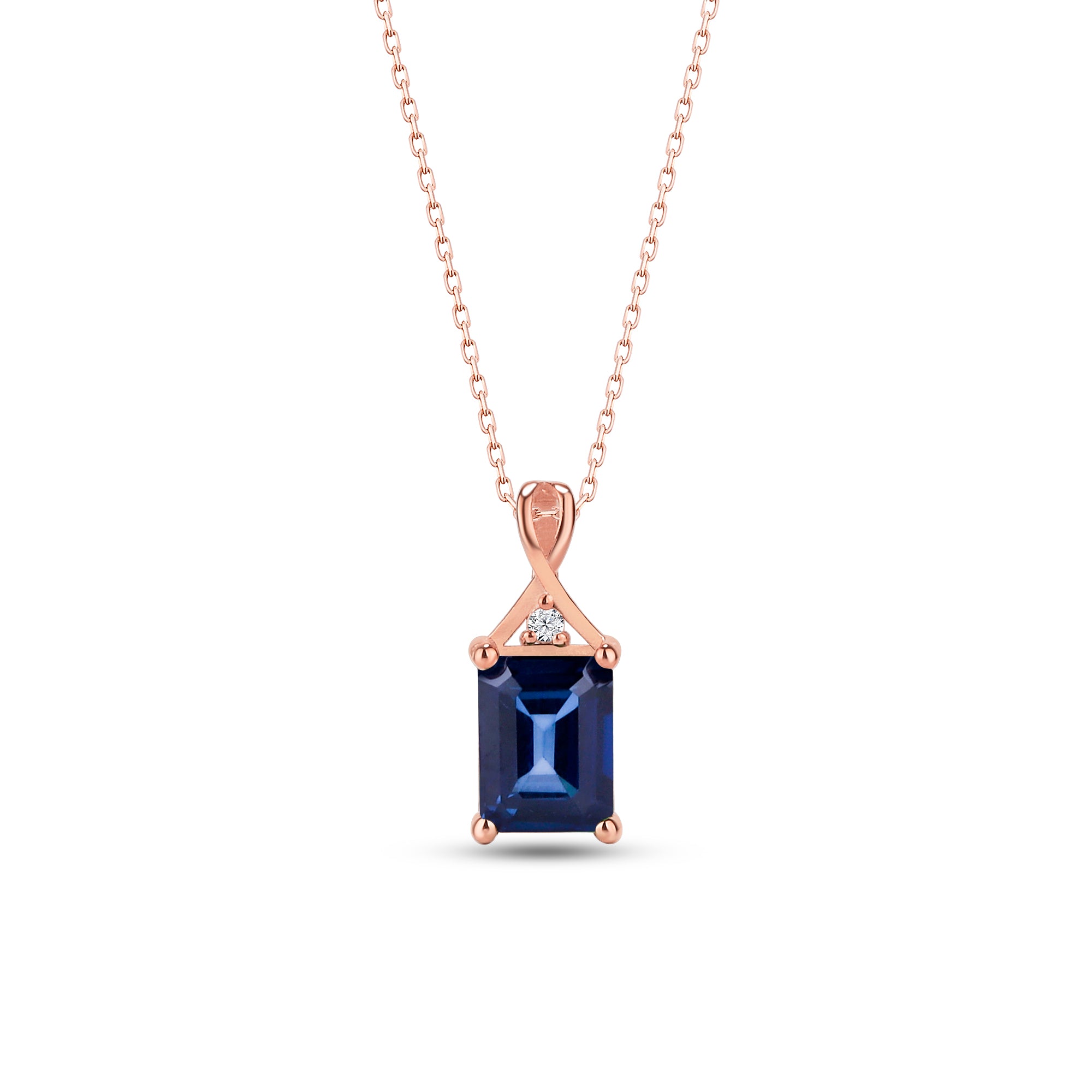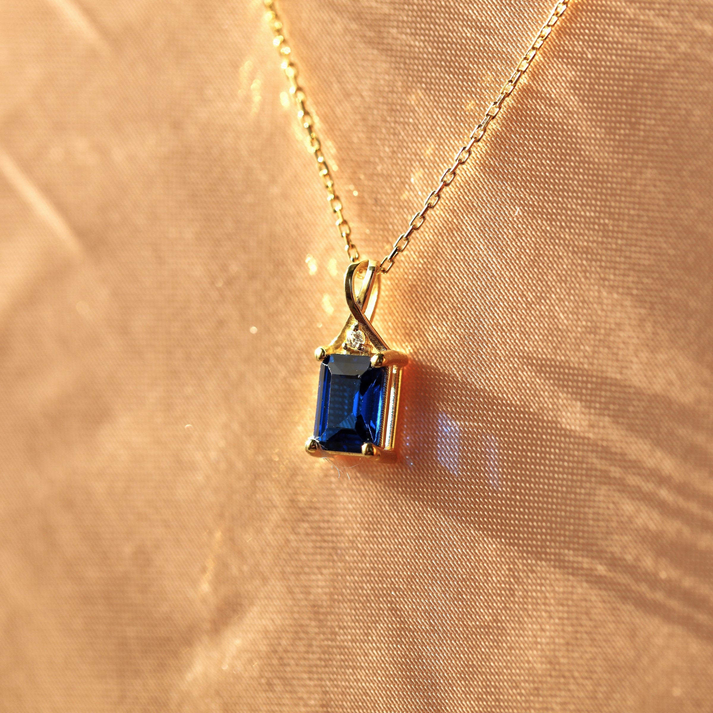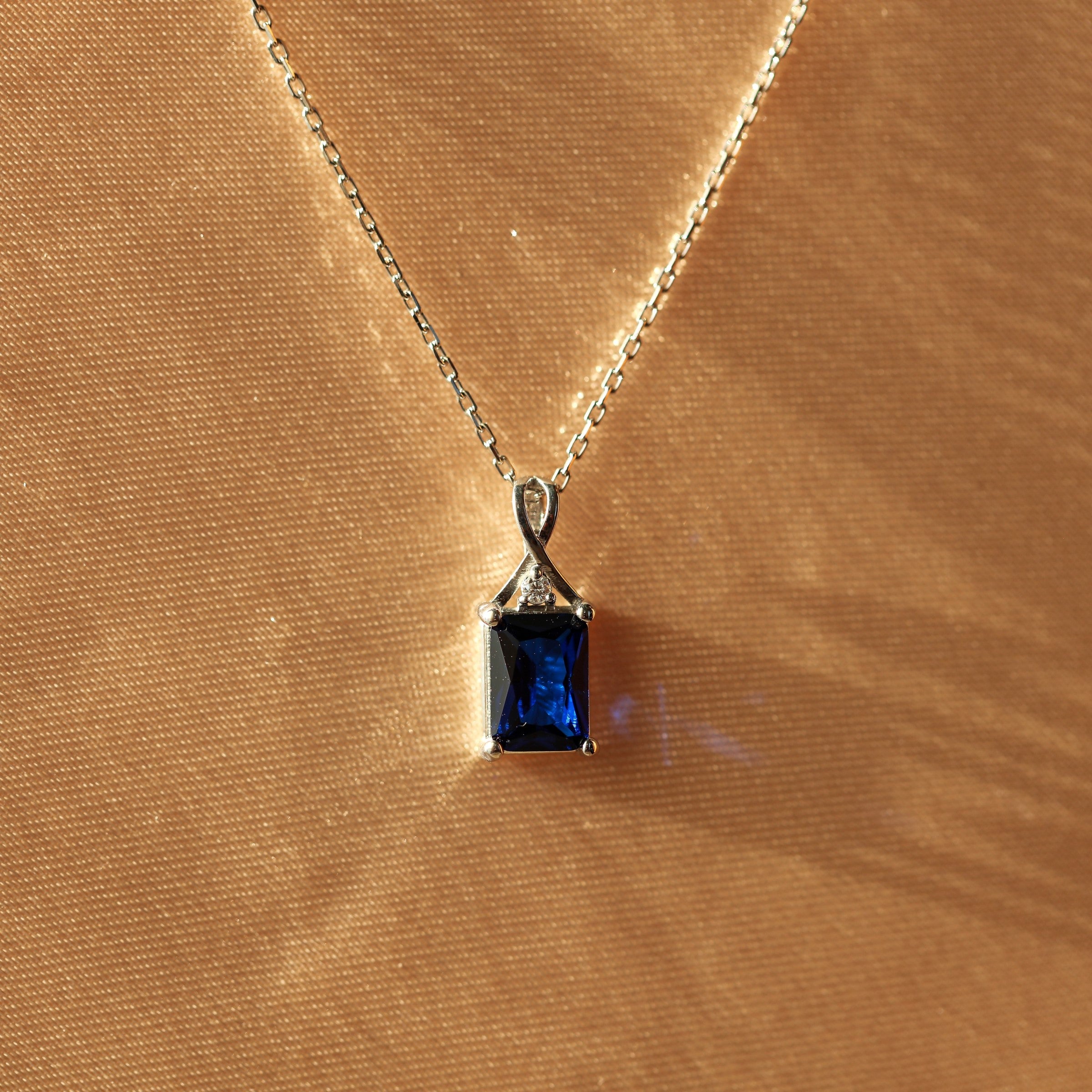 Sapphire Necklace with Natural Diamond - Emerald Cut September Birthstone