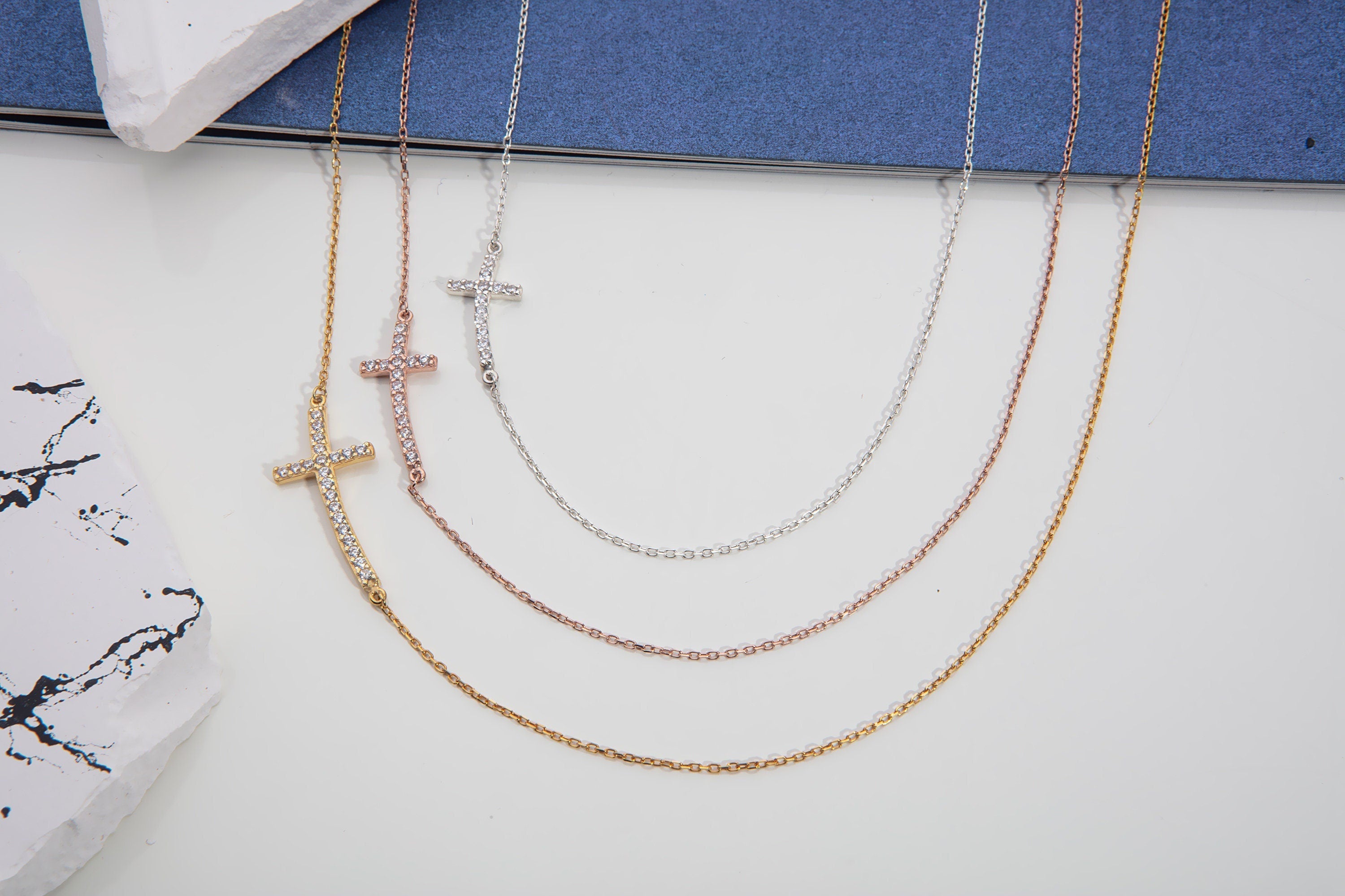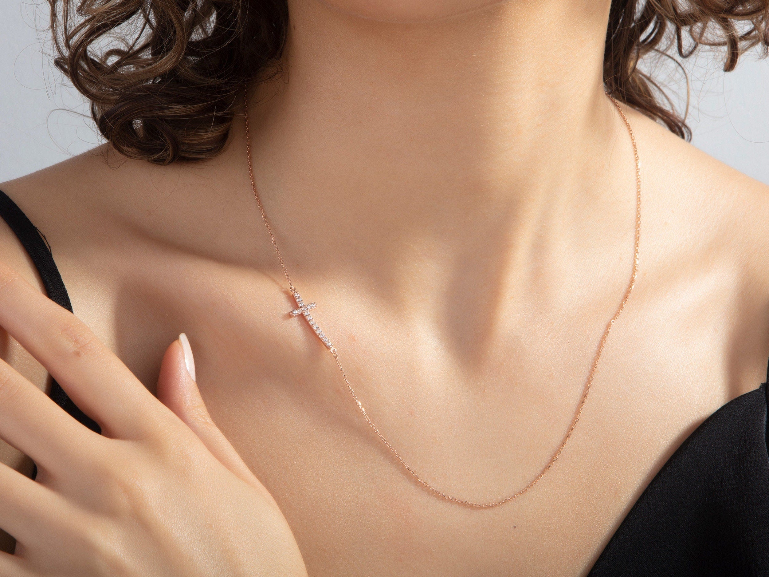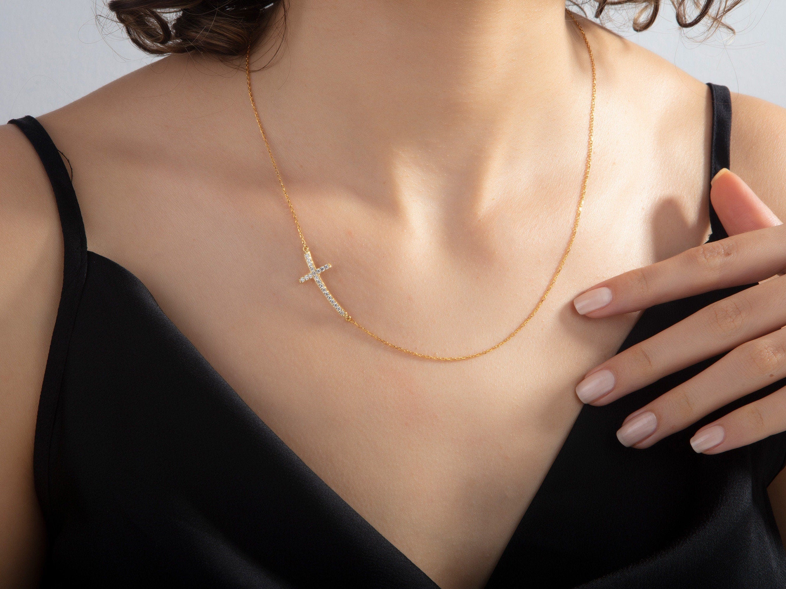 ♥ Our Sideways Zircon Diamond Curved Cross Necklace is a versatile, intimate piece that can be worn everyday with your favorite shirts.
