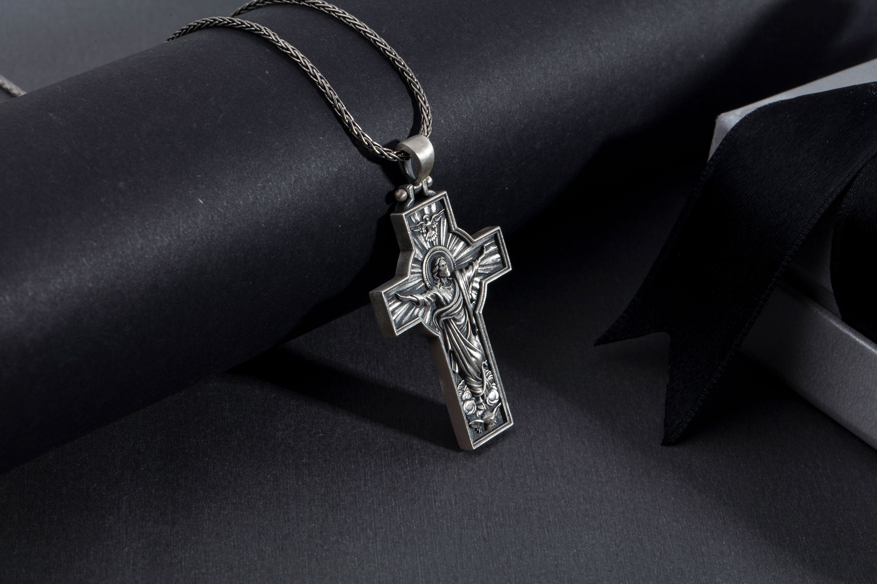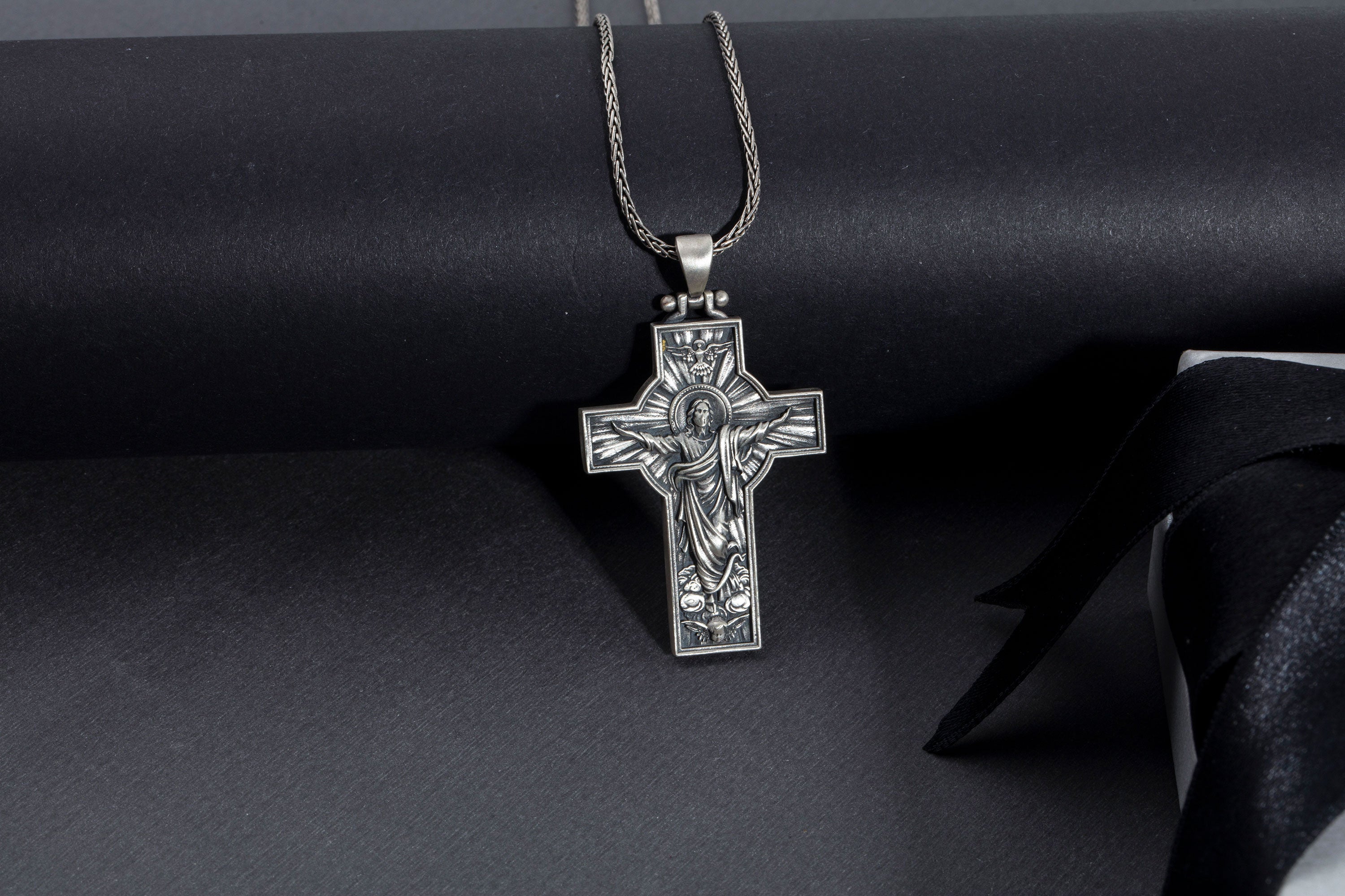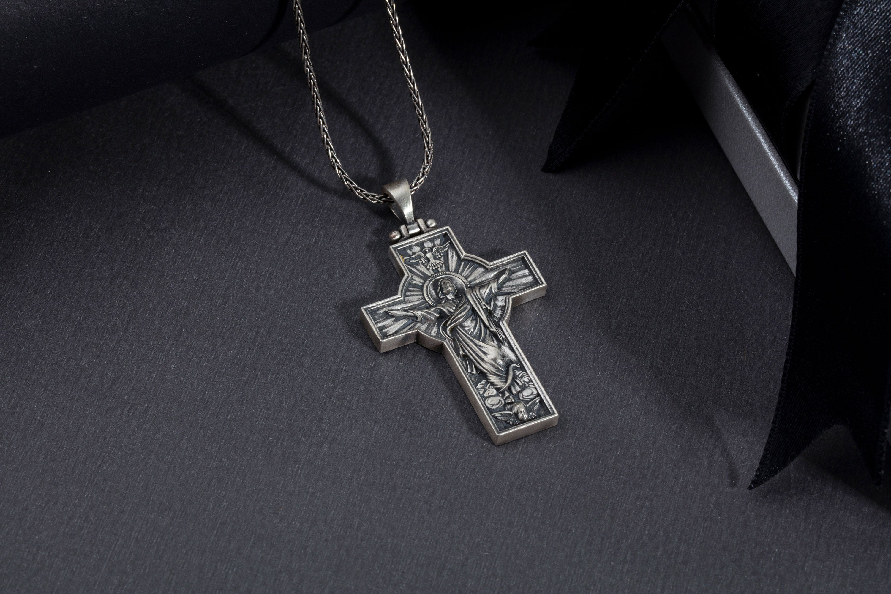 Honor your faith with this powerful Resurrection Cross pendant, masterfully crafted from solid 925 sterling silver. Featuring a detailed relief of the Risen Jesus with outstretched arms, this design symbolizes hope, renewal, and eternal strength. The oxidized antique finish enhances each sculpted detail, giving it a bold, masculine character.